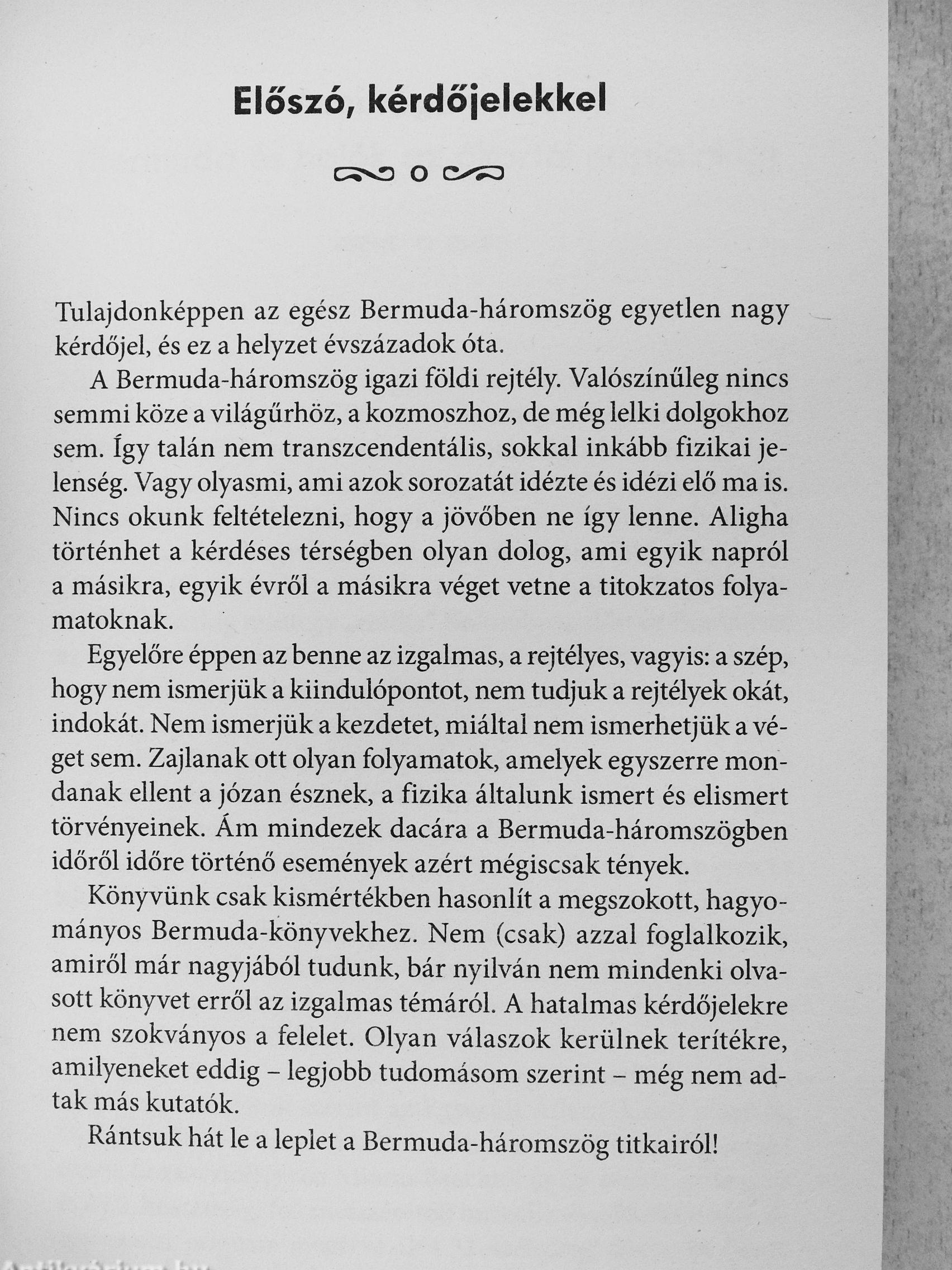 Az Atlanti óceán e vidékén repülőgépek és hajók százaínak veszett nyoma az elmúlt századokban. Itt bizony különös jelenségeket tapasztalnak a hajósok és a pilóták, de olykor még az űrhajósok is. Ahol olyan eáemények, jelenségek is megtörténnek, amelyek bolygónk más tájain szinte sohase.