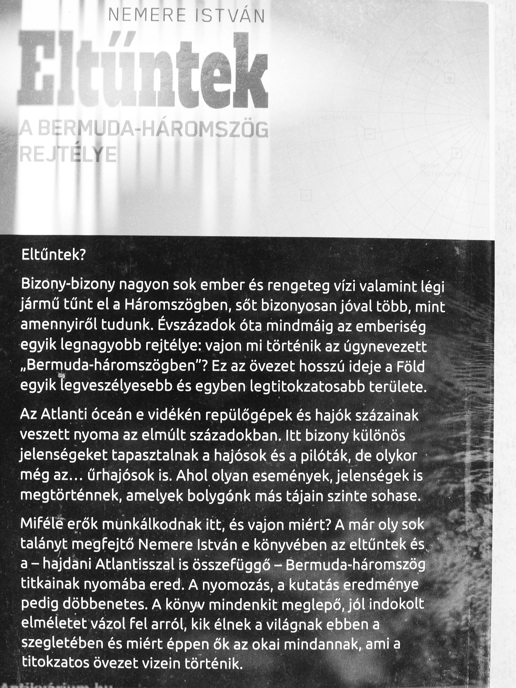 Mifélterők munkálkodnak itt, és vajon miért? A már oly sok talánj^t megfejtő Nemere István e könyvében az eltűntek és^í a - hajdáni Atlantisszal is összefüggő - Bermuda-háromszög-titkainak nyomába ered. A nyomozás, a kutatás^eredménye j pedig döbbenetes. A könyv mindenkit meglepő, jól indokolt || elméletet vázol fel arról, kik élnek a világnak ebben a ' 1 szegletében és miért éppen ők az okai mindannak, ami a titokzatos övezet vizein történik.