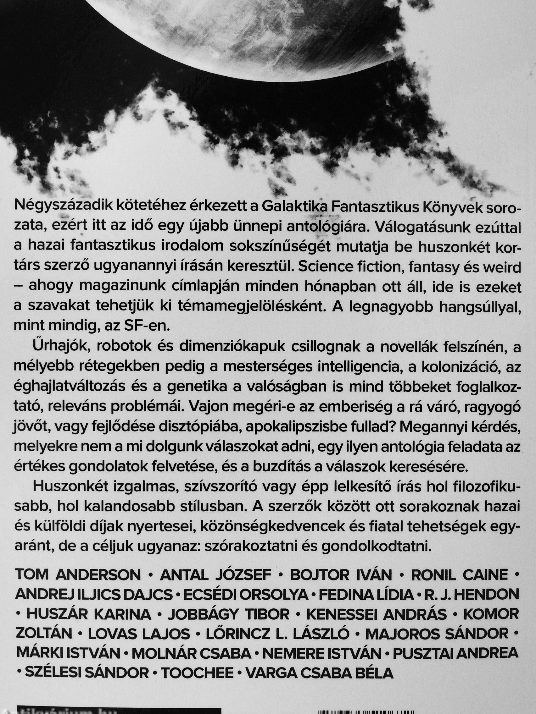 Négyszázadik kötetéhez érkezett a Galaktika Fantasztikus Könyvek sorozata, ezért itt az idő egy újabb ünnepi antológiára. Válogatásunk ezúttal a hazai fantasztikus irodalom sokszínűségét mutatja be huszonkét kortárs szerző ugyanannyi írásán keresztül. Science fiction, fantasy és weird - ahogy magazinunk címlapján minden hónapban ott áll, ide is ezeket a szavakat tehetjük ki témamegjelölésként. A legnagyobb hangsúllyal, mint mindig, az SF-en.