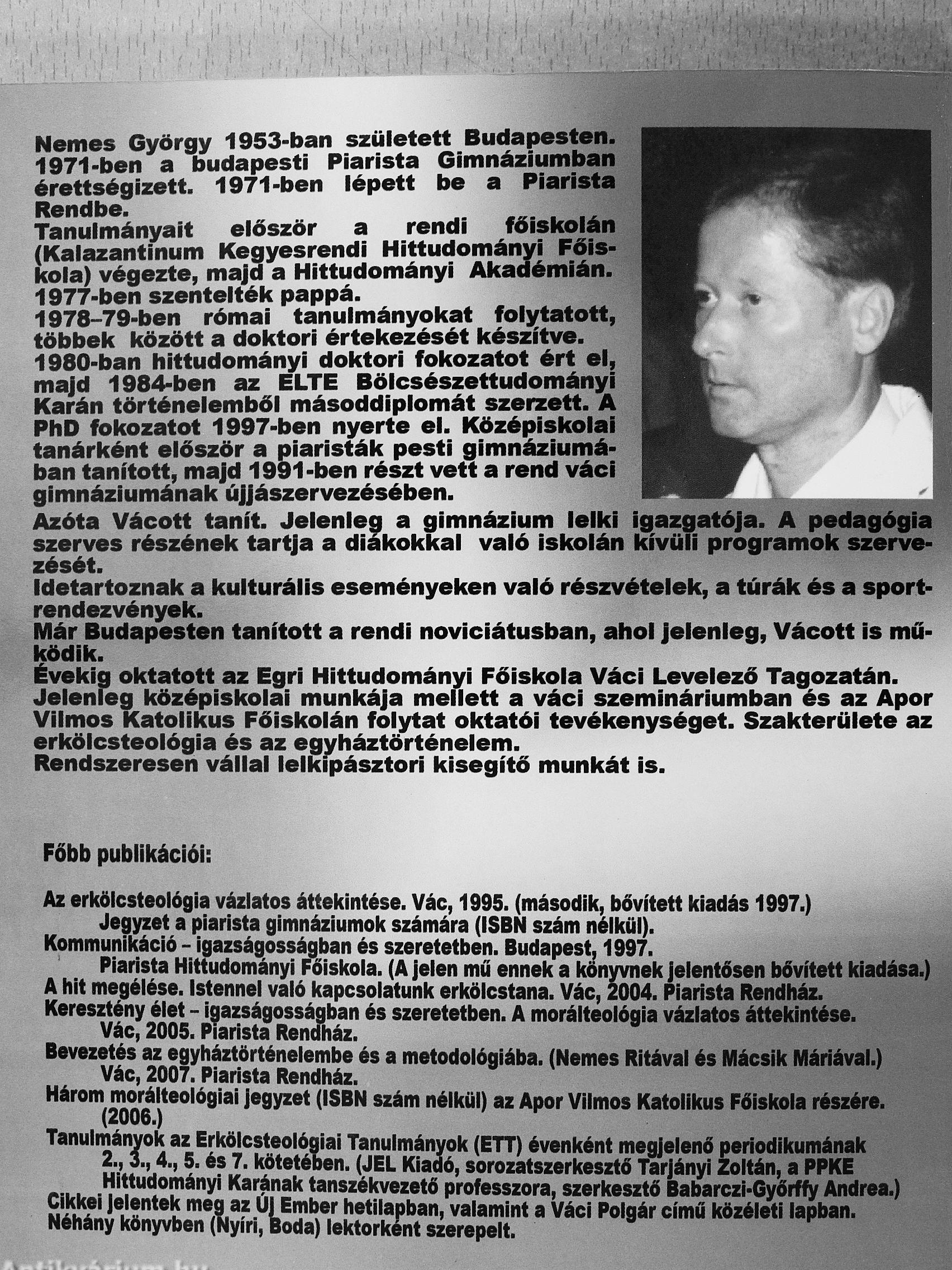 Nemes György 1953-ban született Budapesten. 1971-ben a budapesti Piarista Gimnáziumban érettségizett. 1971-ben lépett be a Piarista Rendbe. ,„. , ,,