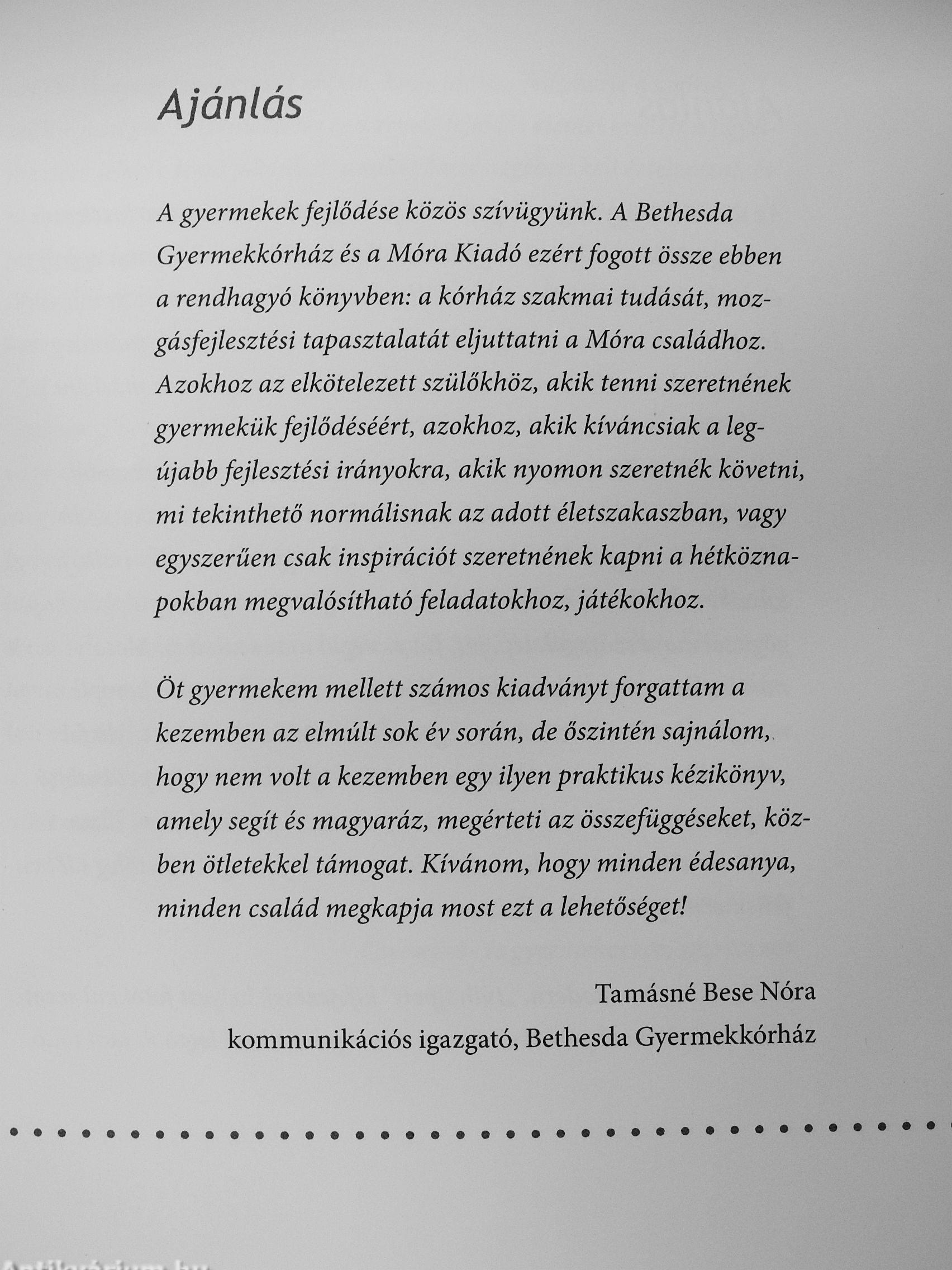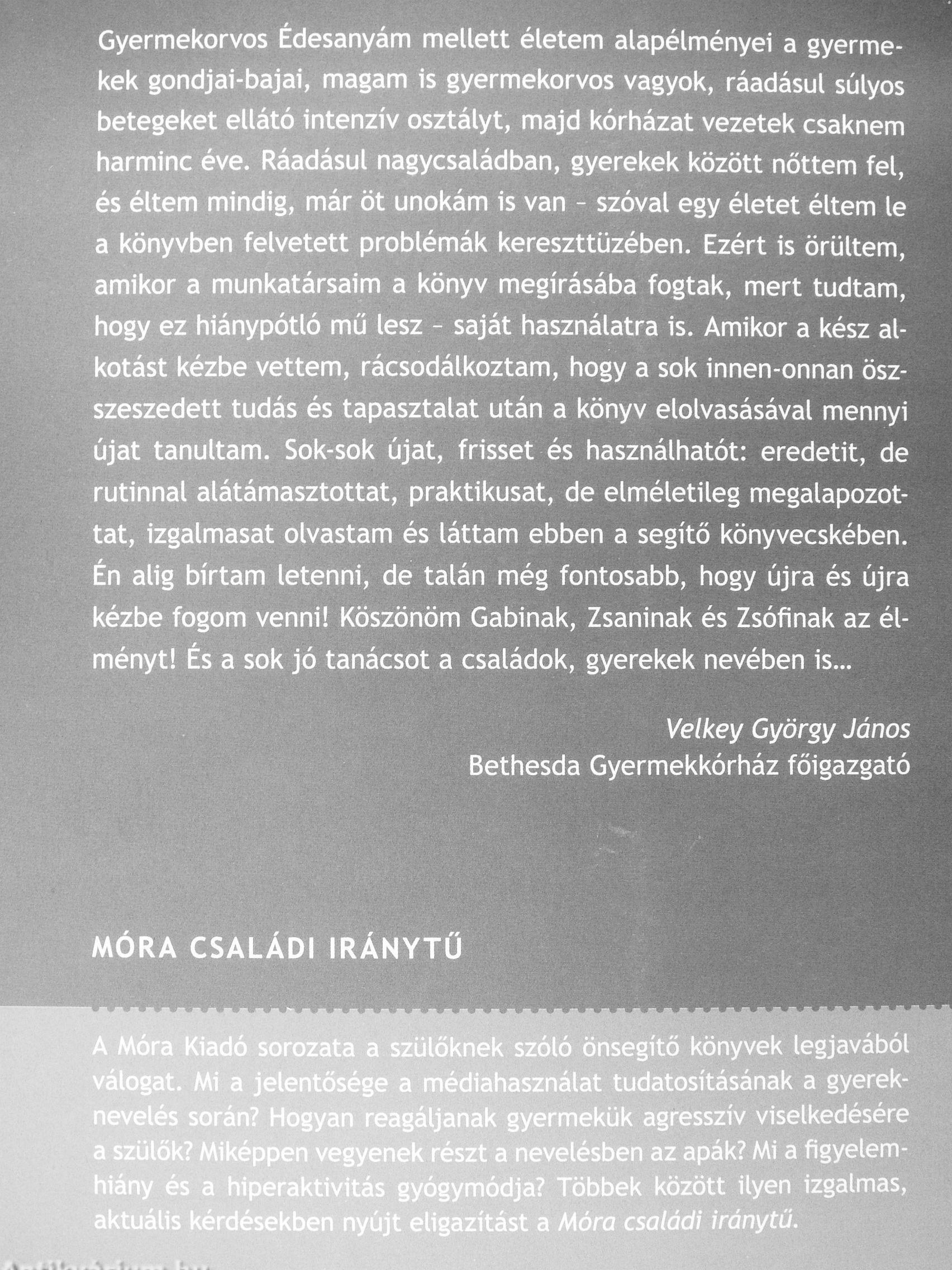 Gyermekorvos Édesanyám mellett életem alapélményei a gyermekek gondjai-bajai, magam is gyermekorvos vagyok, ráadásul súlyos betegeket ellátó intenzív osztályt, majd kórházat vezetek csaknem harminc éve. Ráadásul nagycsaládban, gyerekek között nőttem fel, és éltem mindig, már öt unokám is van - szóval egy életet éltem le a könyvben felvetett problémák kereszttüzében. Ezért is örültem, amikor a munkatársaim a könyv megírásába fogtak, mert tudtam, hogy ez hiánypótló mű lesz - saját használatra is. Amikor a kész alkotást kézbe vettem, rácsodálkoztam, hogy a sok innen-onnan ösz-szeszedett tudás és tapasztalat után a könyv elolvasásával mennyi újat tanultam. Sok-sok újat, frisset és használhatót: eredetit, de rutinnal alátámasztottat, praktikusat, de elméletileg megalapozottat, izgalmasat olvastam és láttam ebben a segítő könyvecskében. Én alig bírtam letenni, de talán még fontosabb, hogy újra és újra kézbe fogom venni! Köszönöm Gabinak, Zsaninak és Zsófinak az élményt! És a sok jó tanácsot a családok, gyerekek nevében is