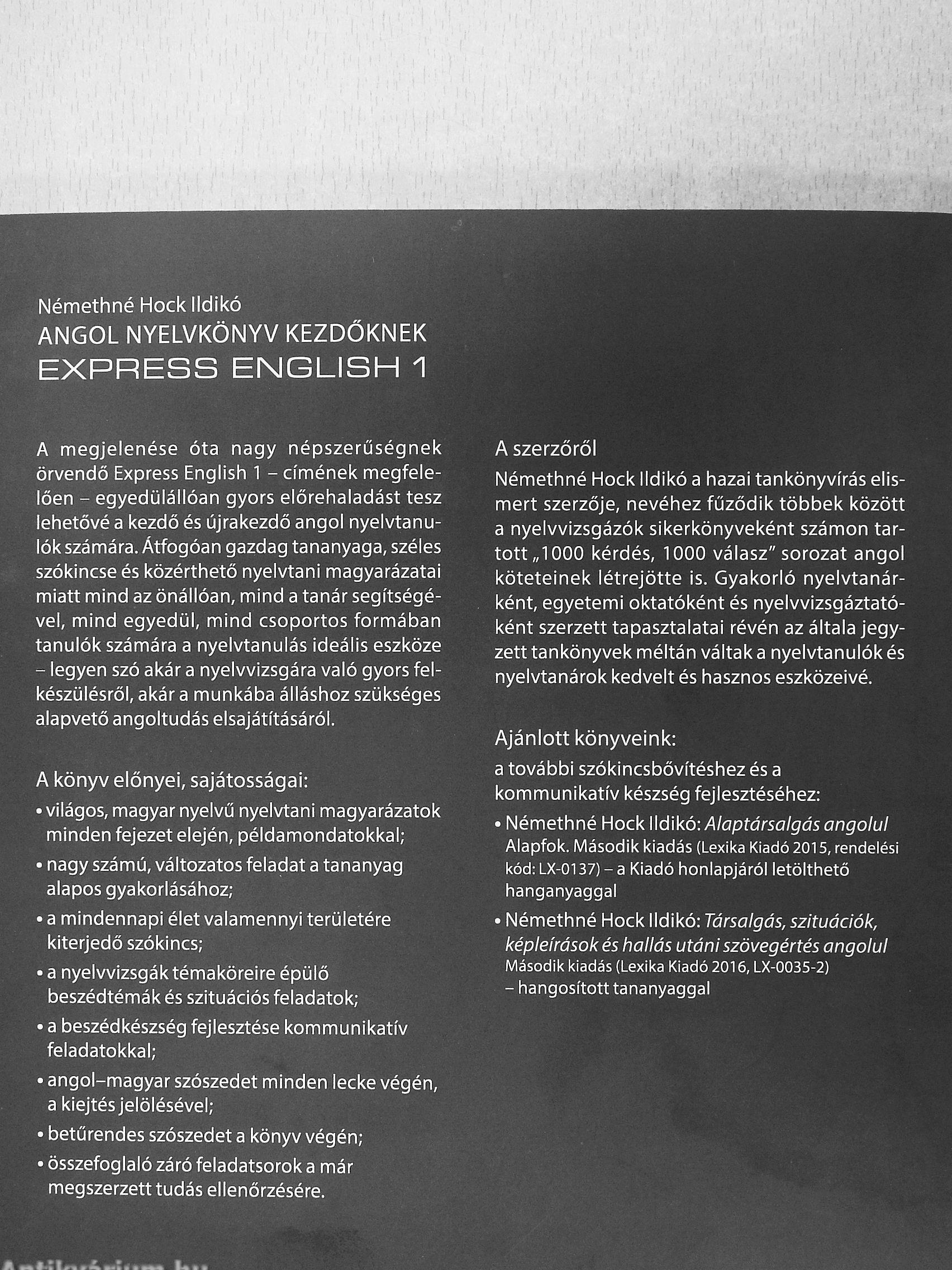 • Némethné Hock Ildikó: Társalgás, szituációk, képleírások és hallás utáni szövegértés angolul Második kiadás (Lexika Kiadó 2016, LX-0035-2)