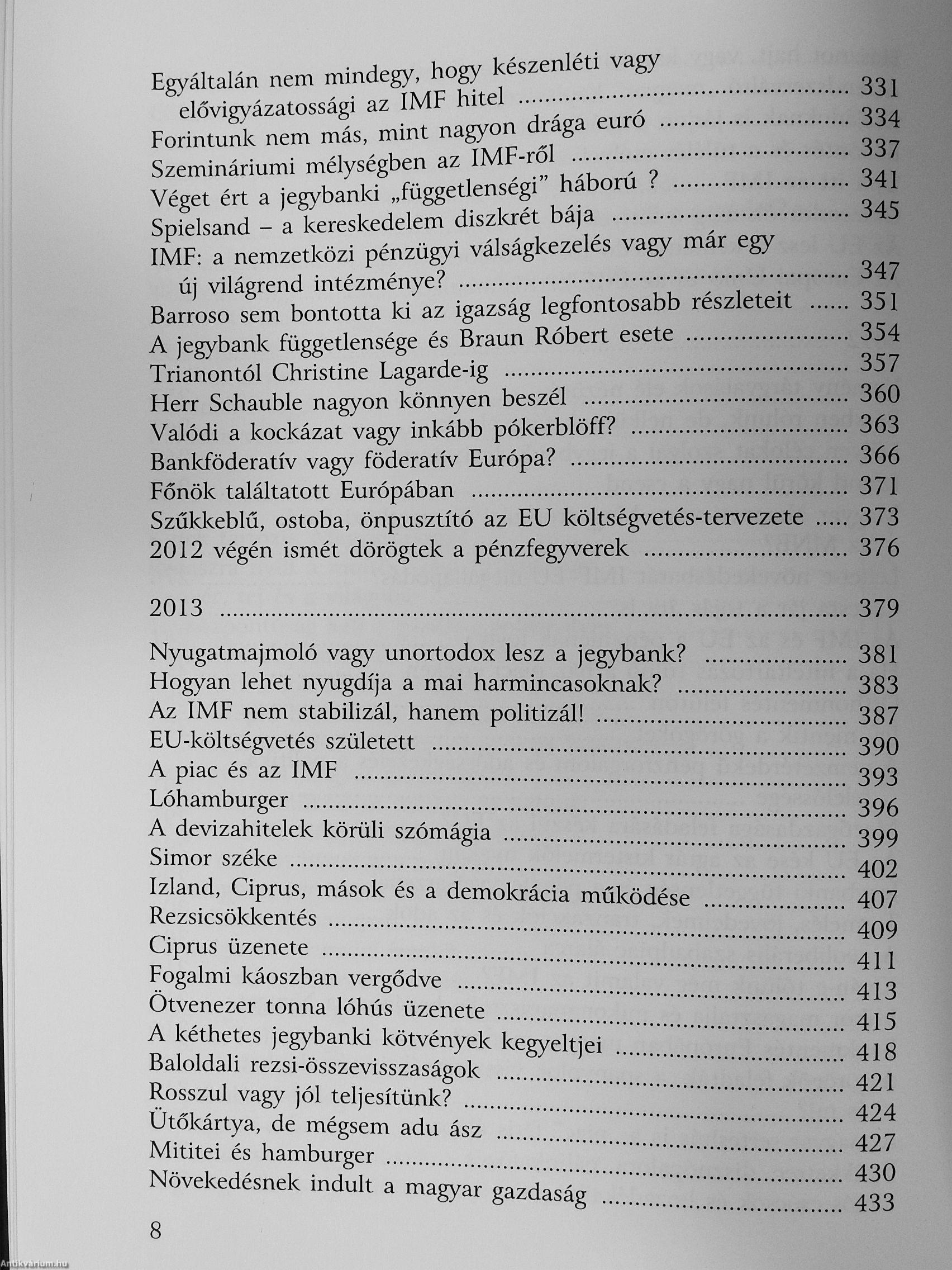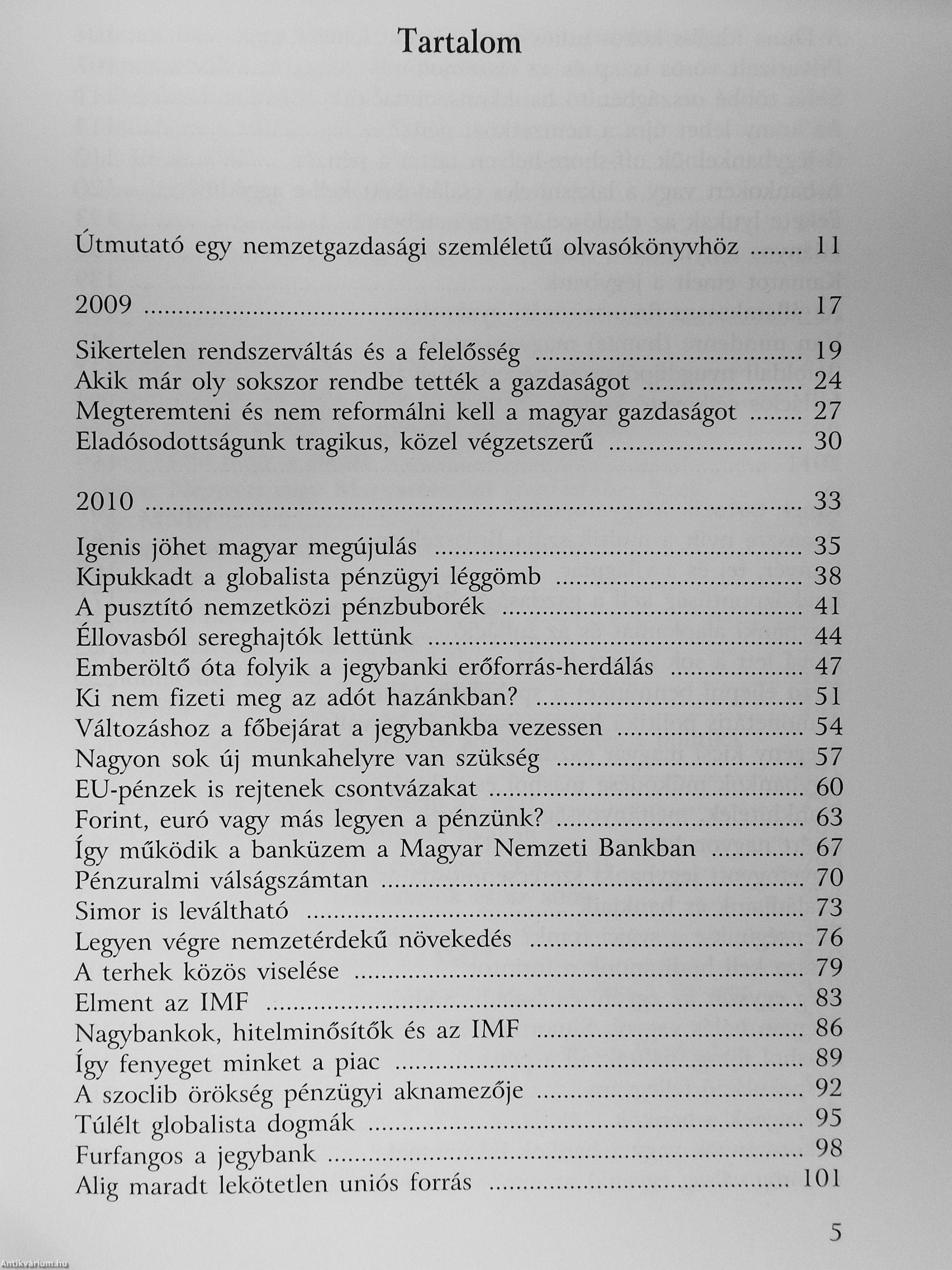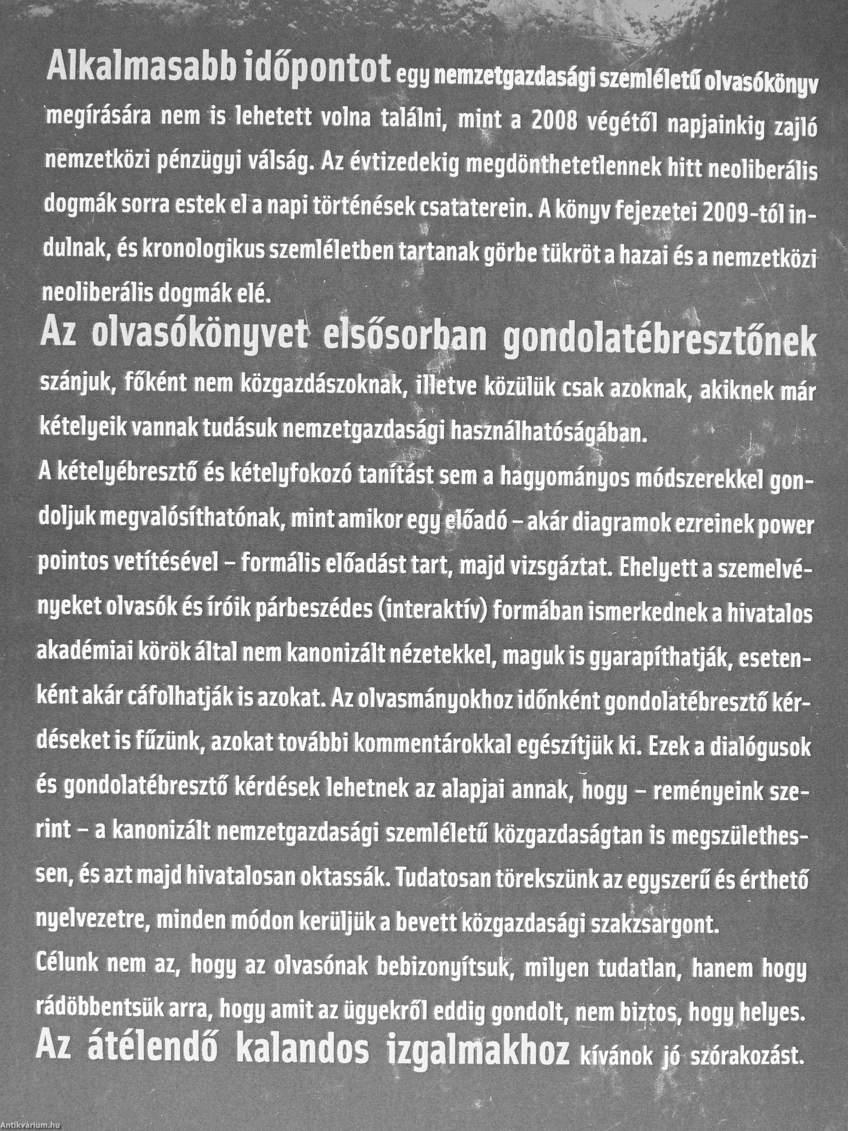 Alkalmasabb idopontot egy nemzetgazdasági szémléletaolvasókönyv megírására nem is lehetett volna találni, mijt a 2008 végétől napjainldg zajló nemzetközi pénzügyi válság. Az évtizedekig megdönthetetlennek tiitt neoliberális dogmák sorra estek el a napi történések csataterein. A könyv fejezetei 20ü9-tó] indulnak, és kronologikus szemléletben t^tanak görbe tükröt a hazai és a nemzetközi neoliberális dogmák elé." _ .