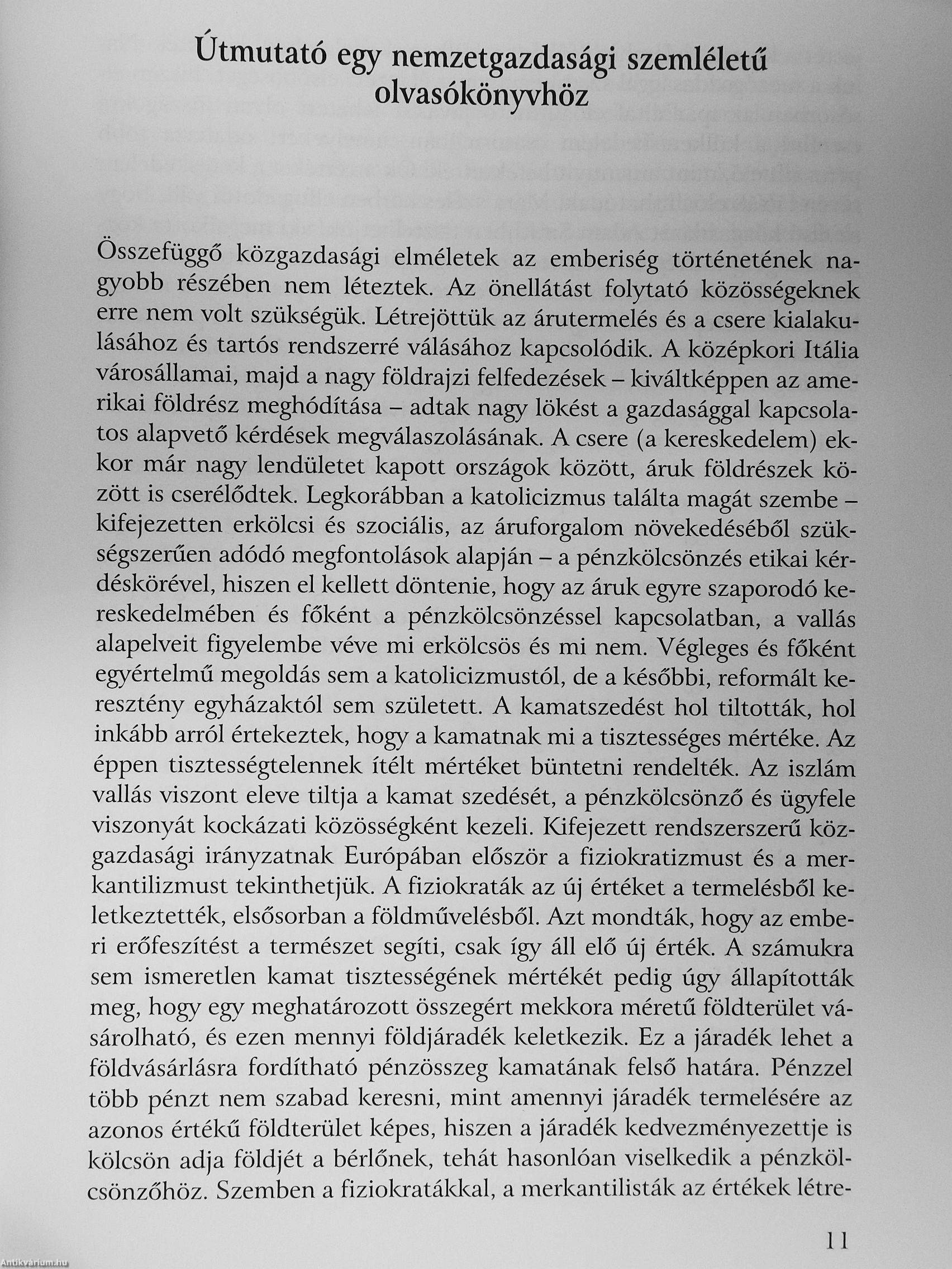 doljuk megvalósíthatónak, mint amikor egy előadó |akár diagramok ezreinek power pointos vetítésével - formális előadást tart, majd vizsgáztat Ehelyett a szemelvényeket olvasók és íróik párbeszédes (interaktív) formában ismerkednek a hivatalos akadémiai körök által nem kanonizált nézetekkel, maguk is gyarapíthatják, esetenként akár cáfolhatják is azokat. Azslvasmányokhoz időnként gondoíMrésztőkér-déseket is fűzünk, azokat további kommentárokkal egészítjük ki. Ezek a dialógusok és gondolatébresztő kérdések lehetnek az alapjai ánnák, liogy - reményeink szerint - a kanonizált nemzetgazdasági szemléletű közgazdaságtan is megszülethessen, és azt majd hivatalosan oktassák. Tudatosan törekszünk az egyszerű és érthető nyelvezetre, minden módon kerüljűka bevettközgazdaságiszakzsargotiL Célunk nem az, hogy az olvasónak bebizonyítsuk, milyen tudatlan, hanem hogy rádöbbentsük arra, liogy amit az ügyekről eddig gondolt, iiem I1Í3I03, hogyjelyes.