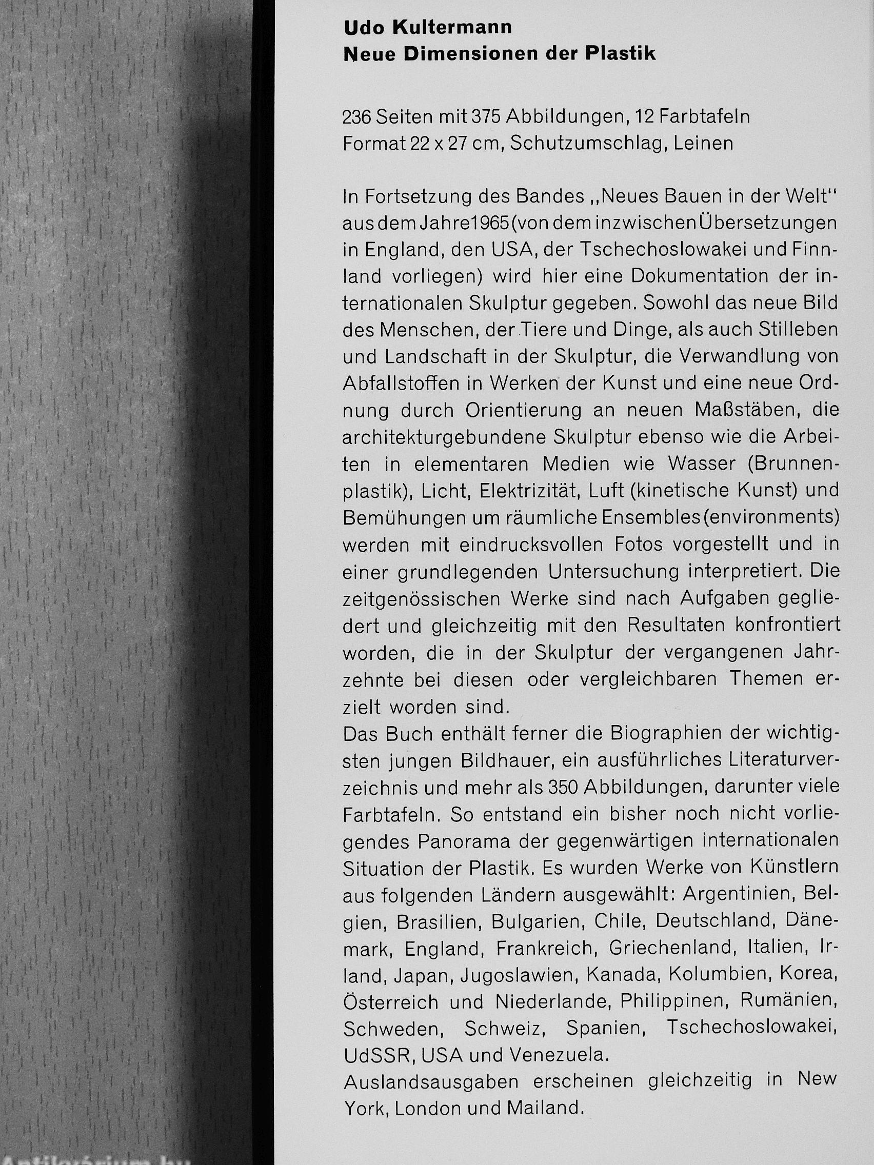 Das Buch enthält ferner die Biographien der wichtigsten jungen Bildhauer, ein ausführliches Literaturverzeichnis und mehr als 350 Abbildungen, darunter viele Farbtafeln, So entstand ein bisher noch nicht vorliegendes Panorama der gegenwärtigen internationalen Situation der Plastik. Es wurden Werke von Künstlern ausfolgenden Ländern ausgewählt: Argentinien, Belgien, Brasilien, Bulgarien, Chile, Deutschland, Dänemark, England, Frankreich, Griechenland, Italien, Irland, Japan, Jugoslawien, Kanada, Kolumbien, Korea, Österreich und Niederlande, Philippinen, Rumänien, Schweden, Schweiz, Spanien, Tschechoslowakei, UdSSR, USA und Venezuela.