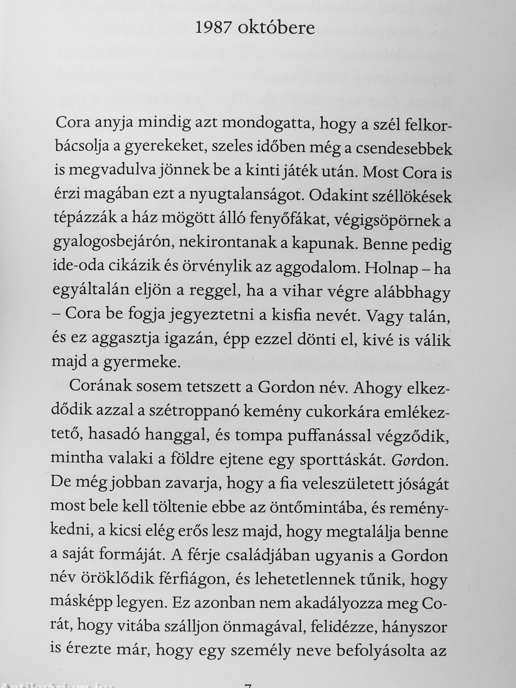 ¦ -Hét évvel .később a fiú neve Bear; a nővére vá-llsztotta, és' a név éppolyelemi-eVővel formálja a sörsát, mirit gz a vifiár, amelynek idején rnegszű-letett. Vagy'taláh Julián, az'á név, amit anyja szívből szeretett ¦volna adni neki, abban a reményben, hogy így iehet majd igazán önmaga. Vagy rhégis'Gordon, az apja után, akinek keménysége és kegyetlensége lassan rányomja bélyegét a fiúra is, de talán még ,rtem késő megállítani ezt az örökséget. ;.