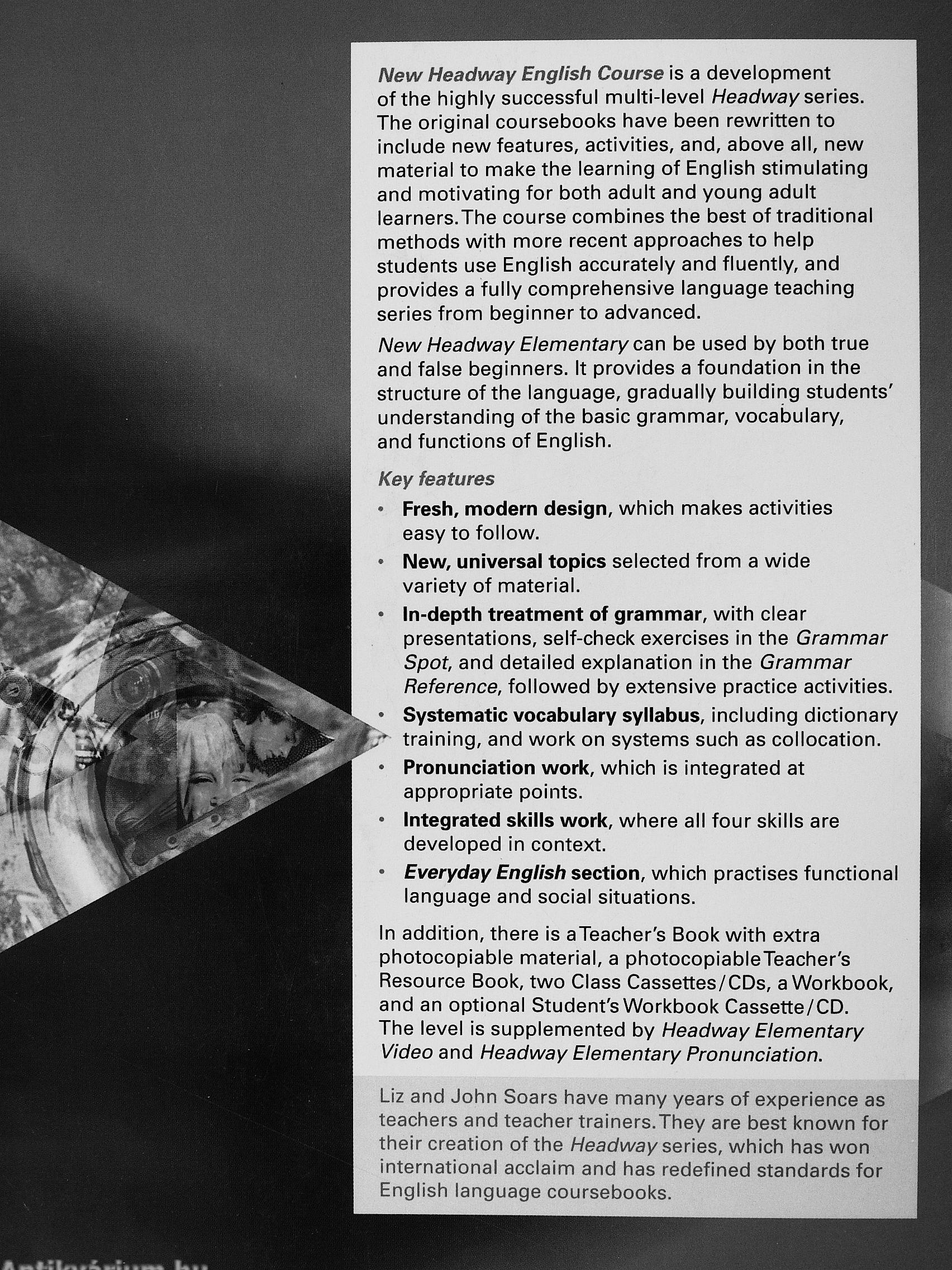 New Headway Elementary can be used by both true and false beginners. It provides a foundation in the structure ofthe language, gradually building students' understanding ofthe basic grammar, vocabulary, and functions of English.