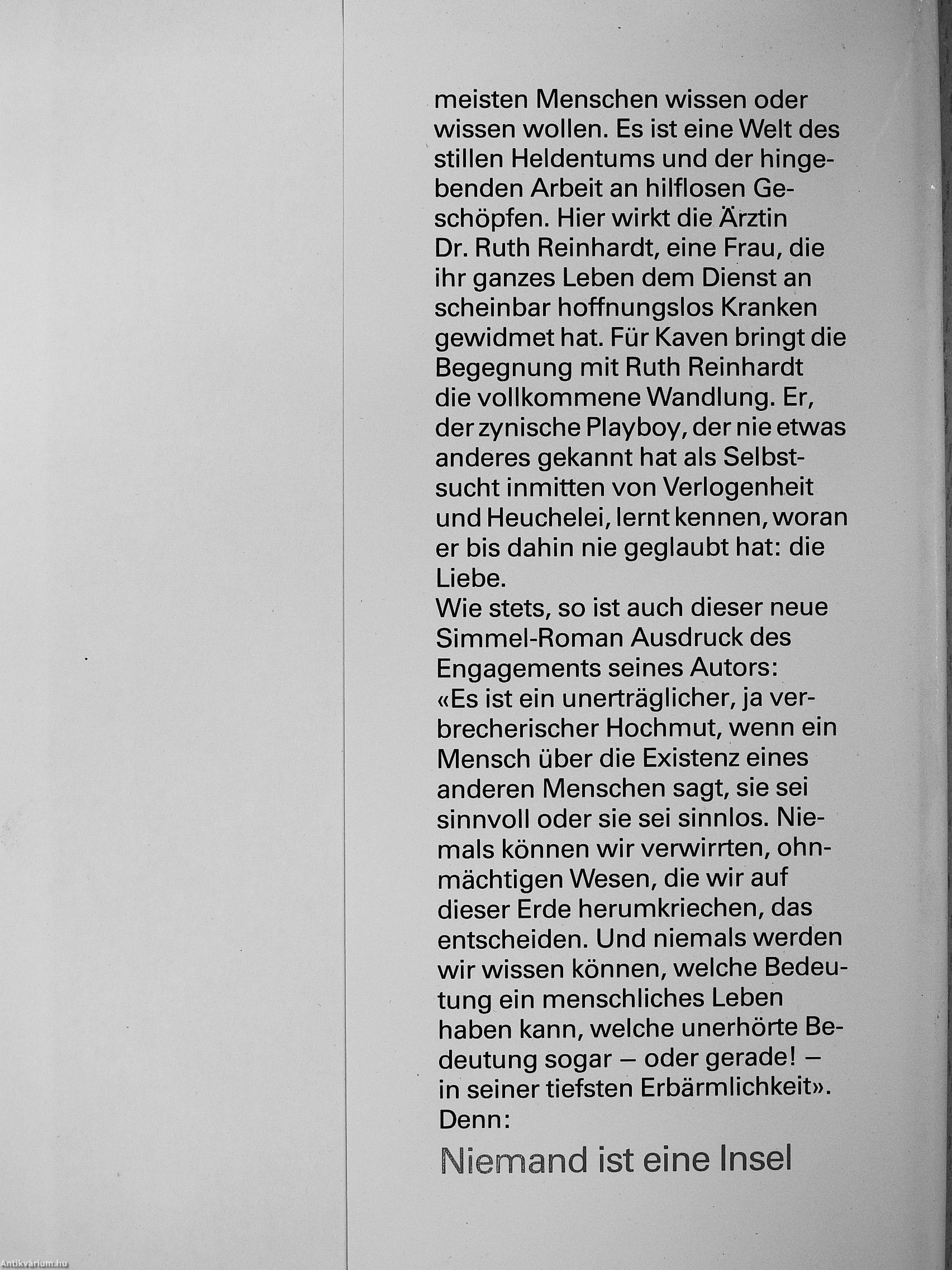 Wie stets, so ist auch dieser neue Simmel-Roman Ausdruck des Engagements seines Autors: «Es ist ein unerträglicher, ja verbrecherischer Hochmut, wenn ein Mensch über die Existenz eines anderen Menschen sagt, sie sei sinnvoll oder sie sei sinnlos. Niemals können wir verwirrten, ohnmächtigen Wesen, die wir auf dieser Erde herumkriechen, das entscheiden. Und niemals werden wir wissen können, welche Bedeutung ein menschliches Leben haben kann, welche unerhörte Bedeutung sogar - oder gerade! -in seiner tiefsten Erbärmlichkeit». Denn: