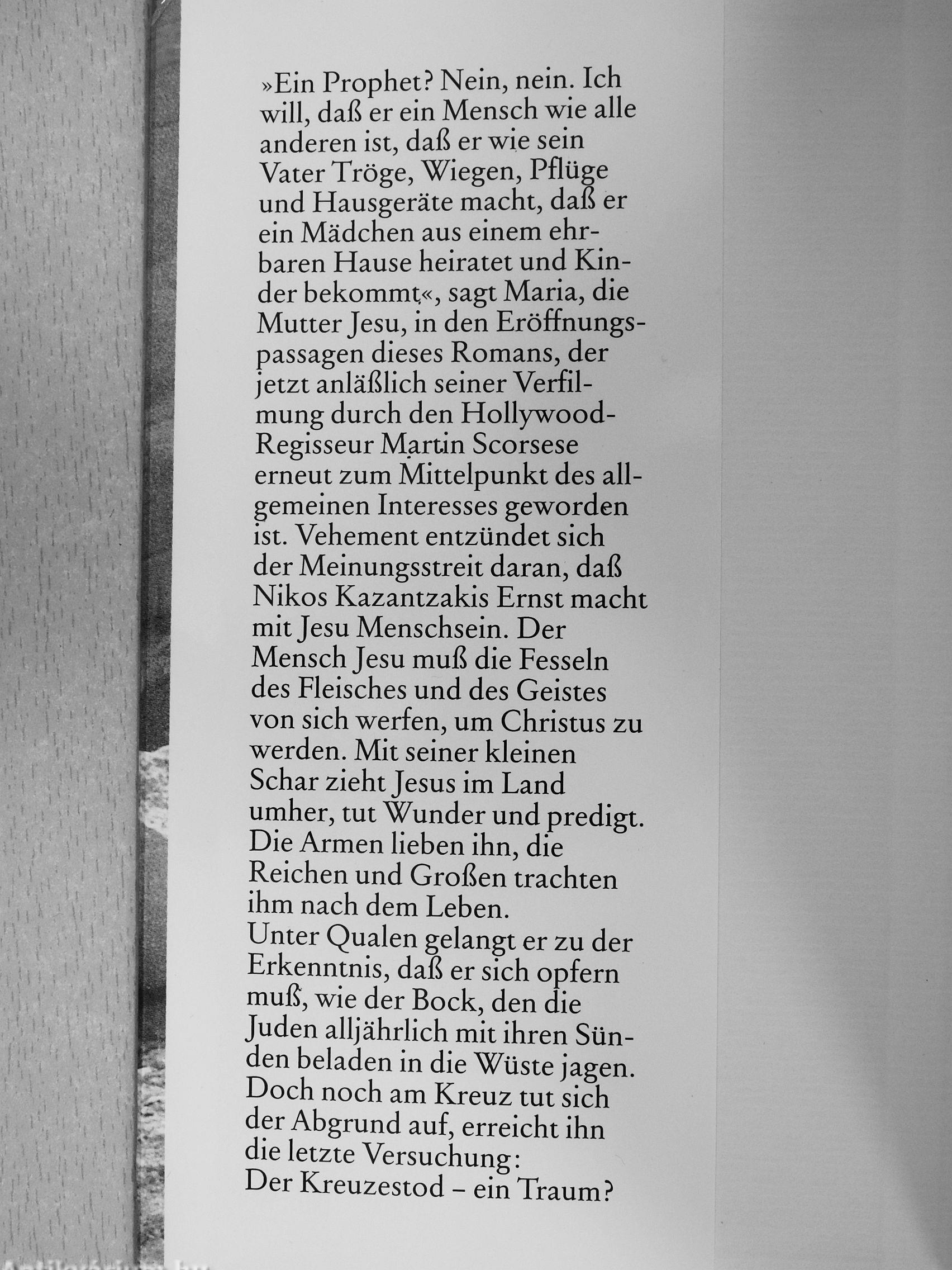»Ein Prophet? Nein, nein. Ich will, daß er ein Mensch wie alle anderen ist, daß er wie sein Vater Tröge, Wiegen, Pflüge und Hausgeräte macht, daß er ein Mädchen aus einem ehrbaren Hause heiratet und Kinder bekommt«, sagt Maria, die Mutter Jesu, in den Eröffnungspassagen dieses Romans, der jetzt anläßlich seiner Verfilmung durch den Hollywood-Regisseur Martin Scorsese erneut zum Mittelpunkt des allgemeinen Interesses geworden ist. Vehement entzündet sich der Meinungsstreit daran, daß Nikos Kazantzakis Ernst macht mit Jesu Menschsein. Der Mensch Jesu muß die Fesseln des Fleisches und des Geistes von sich werfen, um Christus zu werden. Mit seiner kleinen Schar zieht Jesus im Land umher, tut Wunder und predigt. Die Armen lieben ihn, die Reichen und Großen trachten ihm nach dem Leben. Unter Qualen gelangt er zu der Erkenntnis, daß er sich opfern muß, wie der Bock, den die Juden alljährlich mit ihren Sünden beladen in die Wüste jagen. Doch noch am Kreuz tut sich der Abgrund auf, erreicht ihn die letzte Versuchung: Der Kreuzestod - ein Traum?