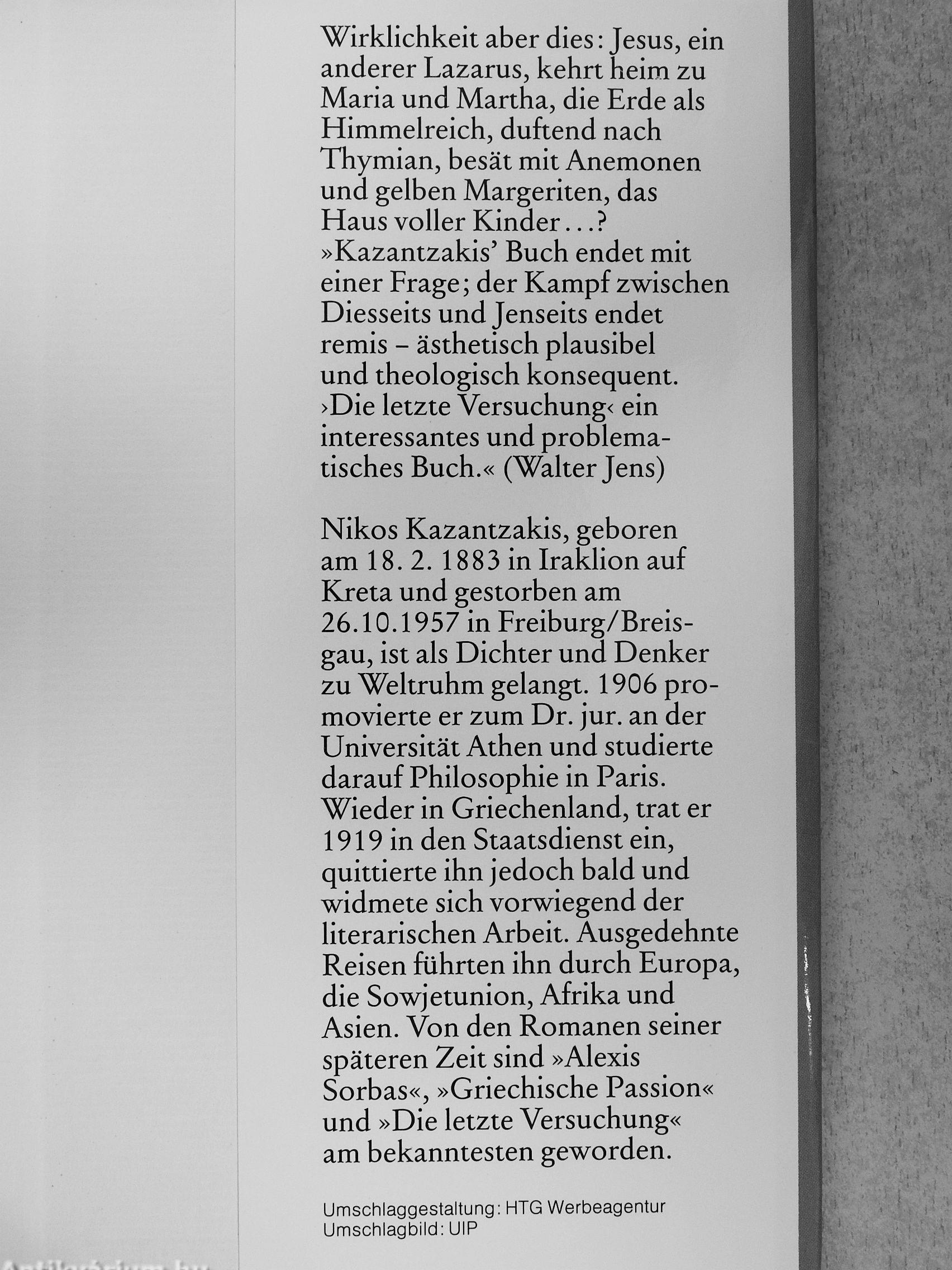 Wirklichkeit aber dies: Jesus, ein anderer Lazarus, kehrt heim zu Maria und Martha, die Erde als Himmelreich, duftend nach Thymian, besät mit Anemonen und gelben Margeriten, das Haus voller Kinder ? »Kazantzakis' Buch endet mit einer Frage; der Kampf zwischen Diesseits und Jenseits endet remis - ästhetisch plausibel und theologisch konsequent. >Die letzte Versuchung< ein interessantes und problematisches Buch.« (Walter Jens)