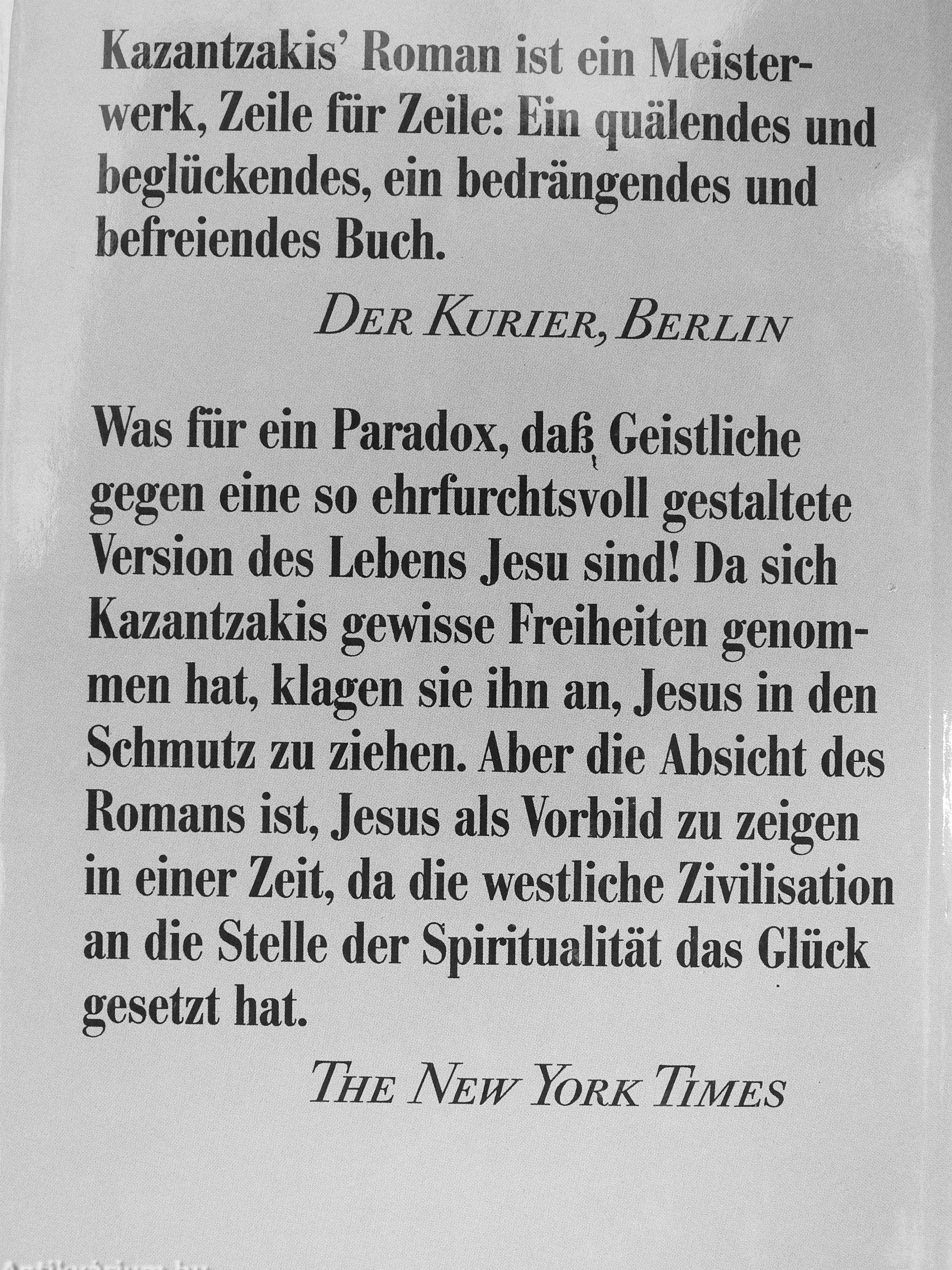 Kazantzakis' Roman ist ein Meisterwerk, Zeile fiir Zeile: Ein quälendes und beglückendes, ein bedrängendes und befreiendes Buch.