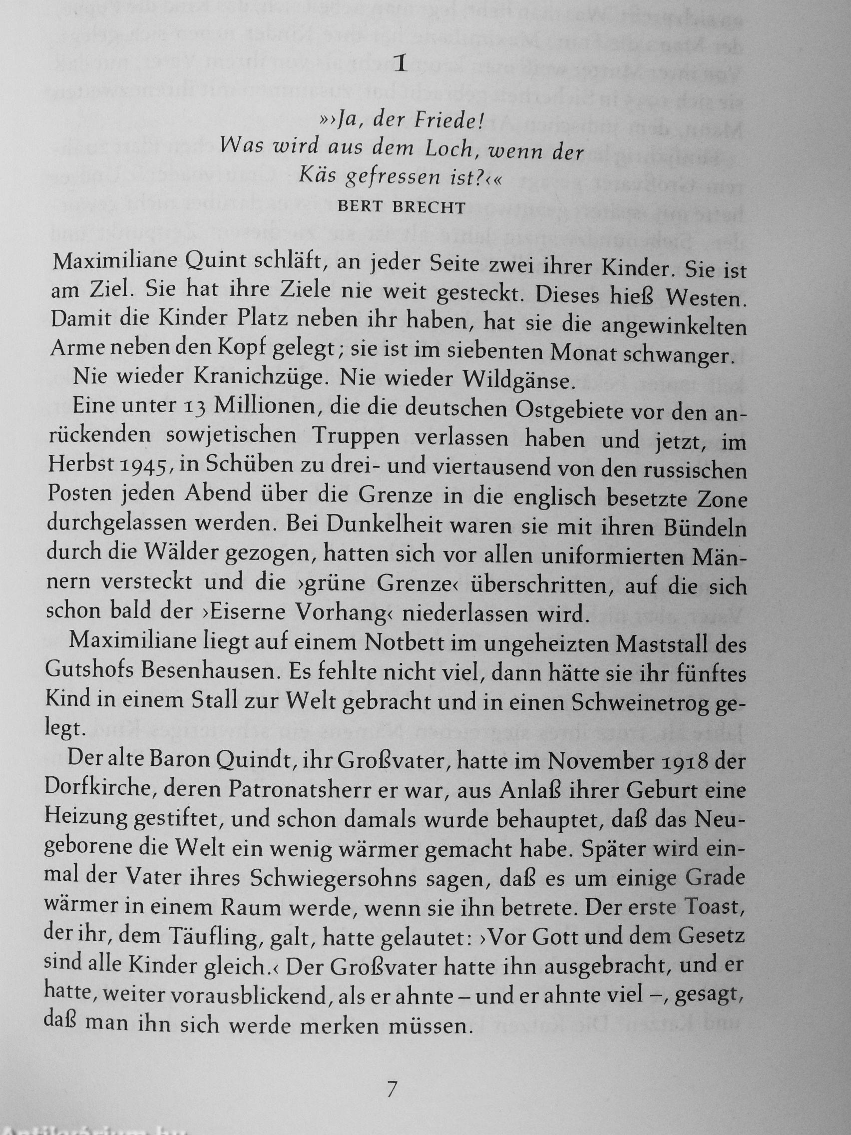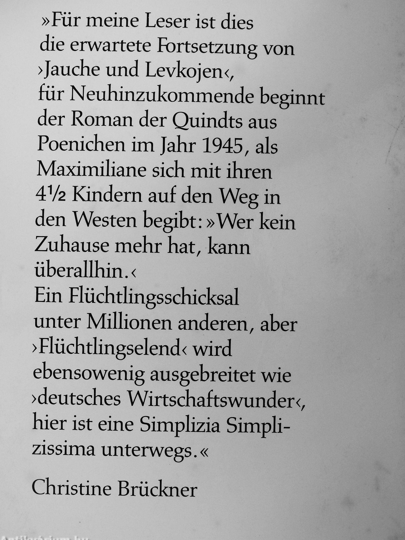 »Für meine Leser ist dies die erwartete Fortsetzung von >Jauche und Levkojen<, für Neuhinzukommende beginnt der Roman der Quindts aus Poenichen im Jahr 1945, als Maximiliane sich mit ihren 4V2 Kindern auf den Weg in den Westen begibt: »Wer kein Zuhause mehr hat, kann überallhin. <