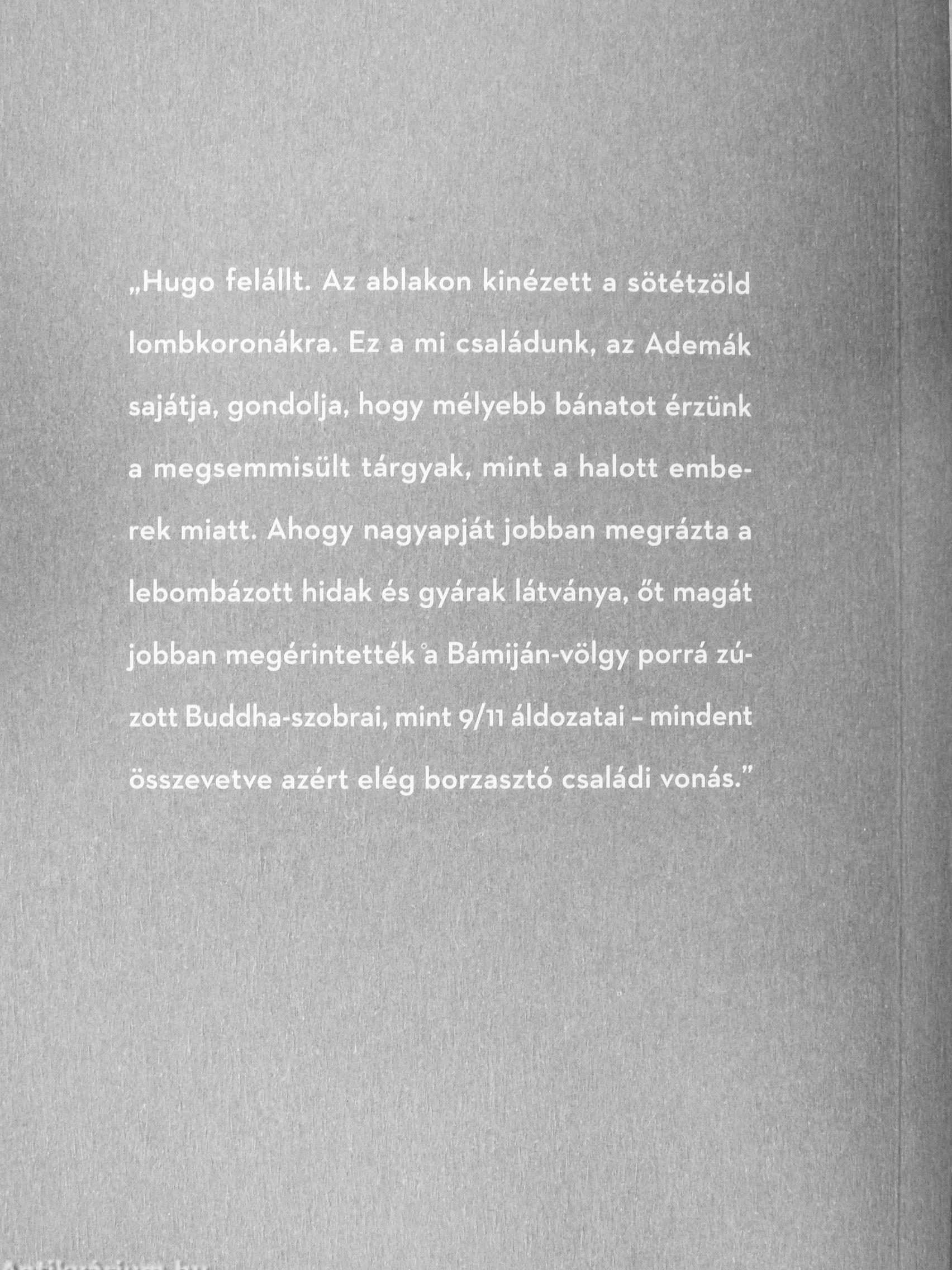 a megsemmisült tárgyak, mint a halott emberek miatt. Ahogy nagyapját jobban megrázta a lebombázott hidak és gyárak látványa, őt magát jobban megérintették °a Bámiján-völgy porrá zúzott Buddha-szobrai, mint 9/n áldozatai - mindent összevetve azért elég borzasztó családi vonás."