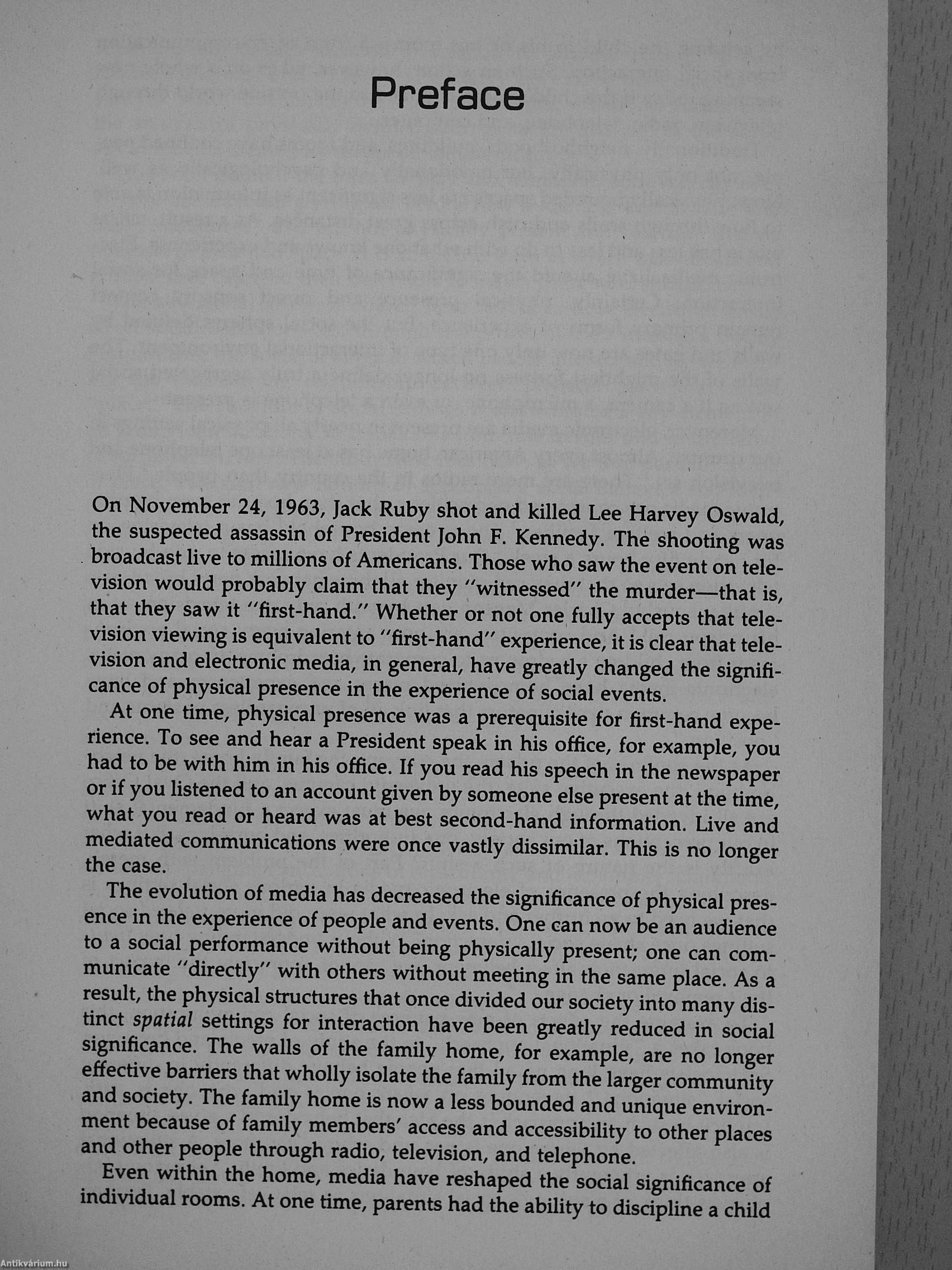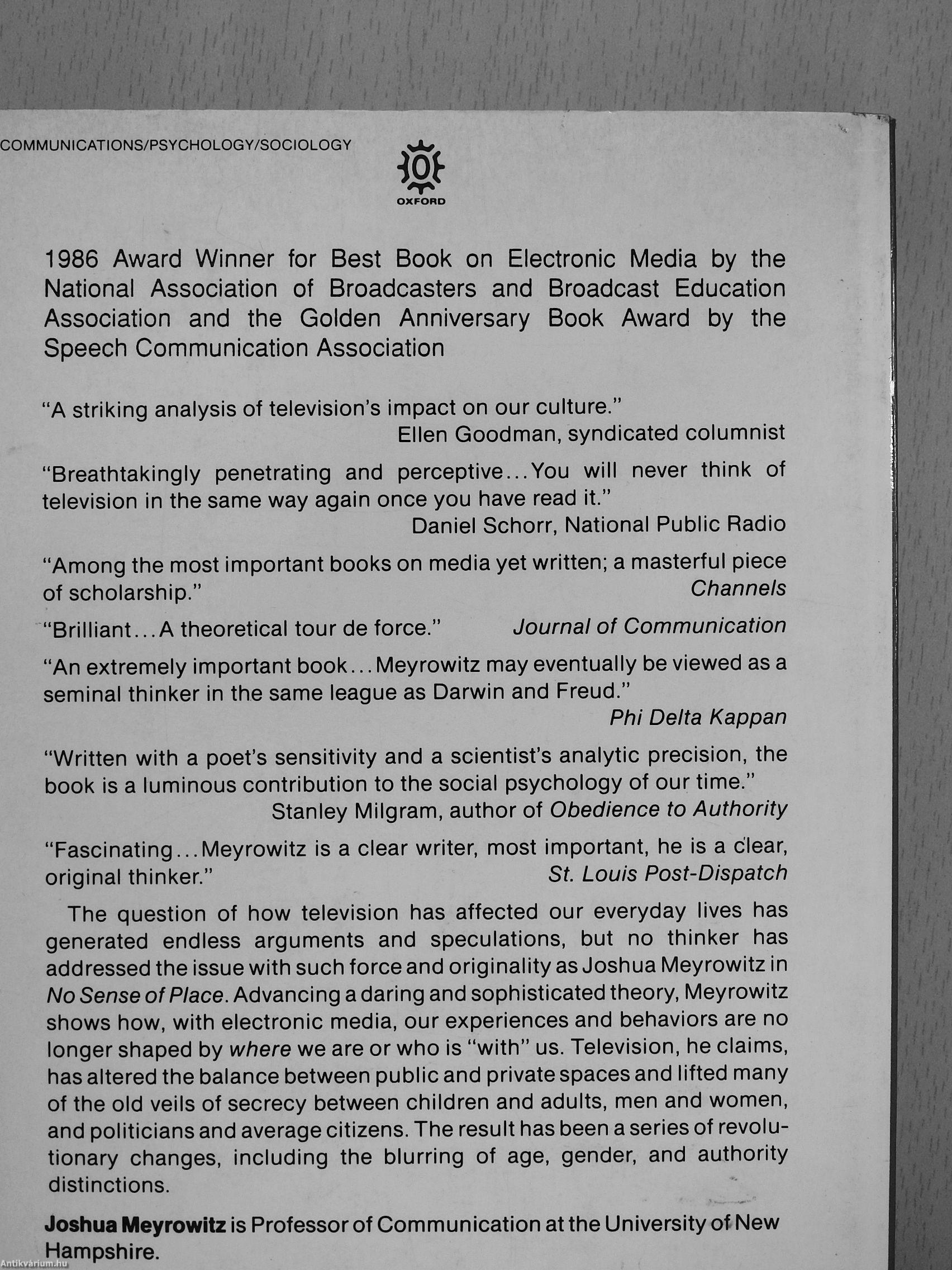 The question of how television has affected our everyday lives has generated endless arguments and speculations, but no thinker has addressed the issue with such force and originality as Joshua Meyrowitz in No Sense of Place. Advancing a daring and sophisticated theory, Meyrowitz shows how, with electronic media, our experiences and behaviors are no longer shaped by where we are or who is "with" us. Television, he claims, has altered the balance between public and private spaces and lifted many of the old veils of secrecy between children and adults, men and women, and politicians and average citizens. The result has been a series of revolutionary changes, including the blurring of age, gender, and authority distinctions.
