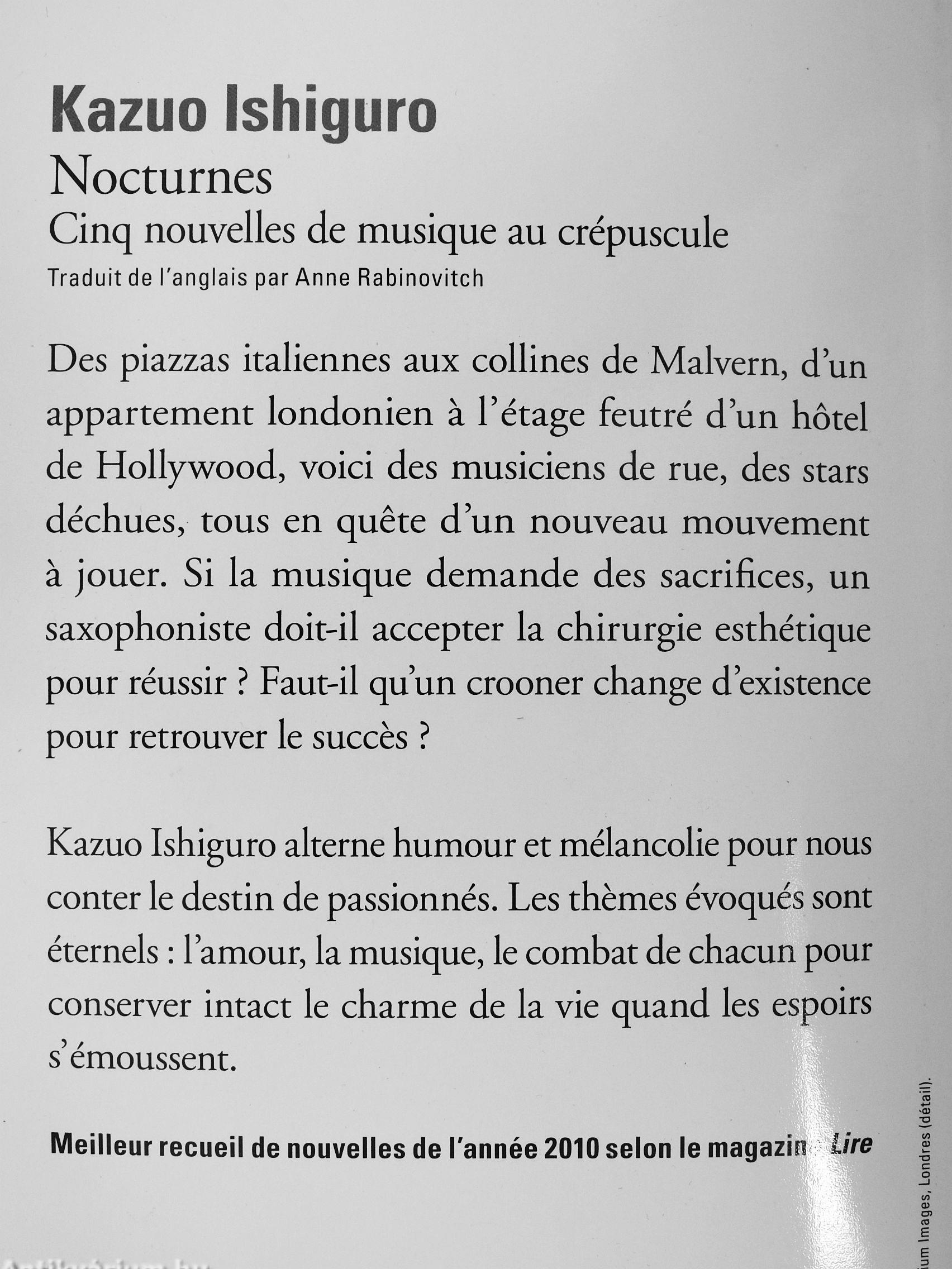 Kazuo Ishiguro alterne humour et mélancolie pour nous conter le destin de passionnés. Les themes évoqués sont éternels : l'amour, la musique, le combat de chacun pour conserver intact le charme de la vie quand les espoirs s'émoussent.