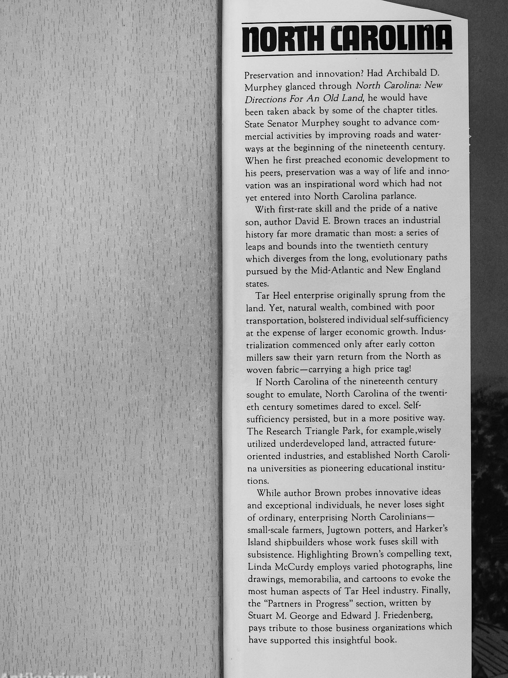 Preservation and innovation? Had Archibald D. Murphey glanced through Nonb Carolina: New Directions For An Old Land, he would have been taken aback by some of the chapter titles. State Senator Murphey sought to advance commercial activities by improving roads and waterways at the beginning of the nineteenth century. When he first preached economic development to his peers, preservation was a way of life and innovation was an inspirational word which had not yet entered into North Carolina parlance.