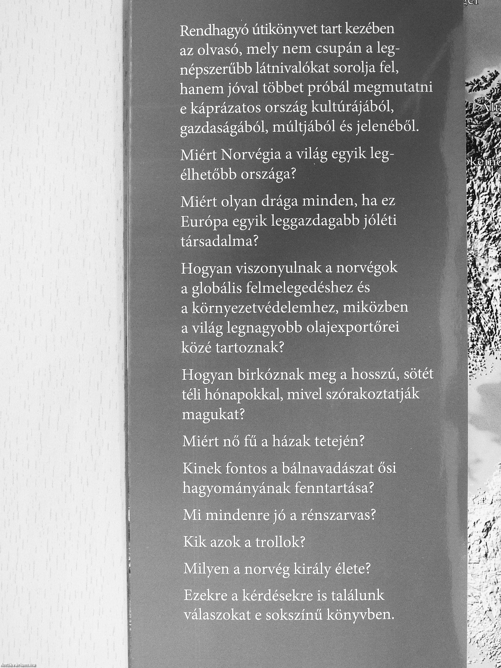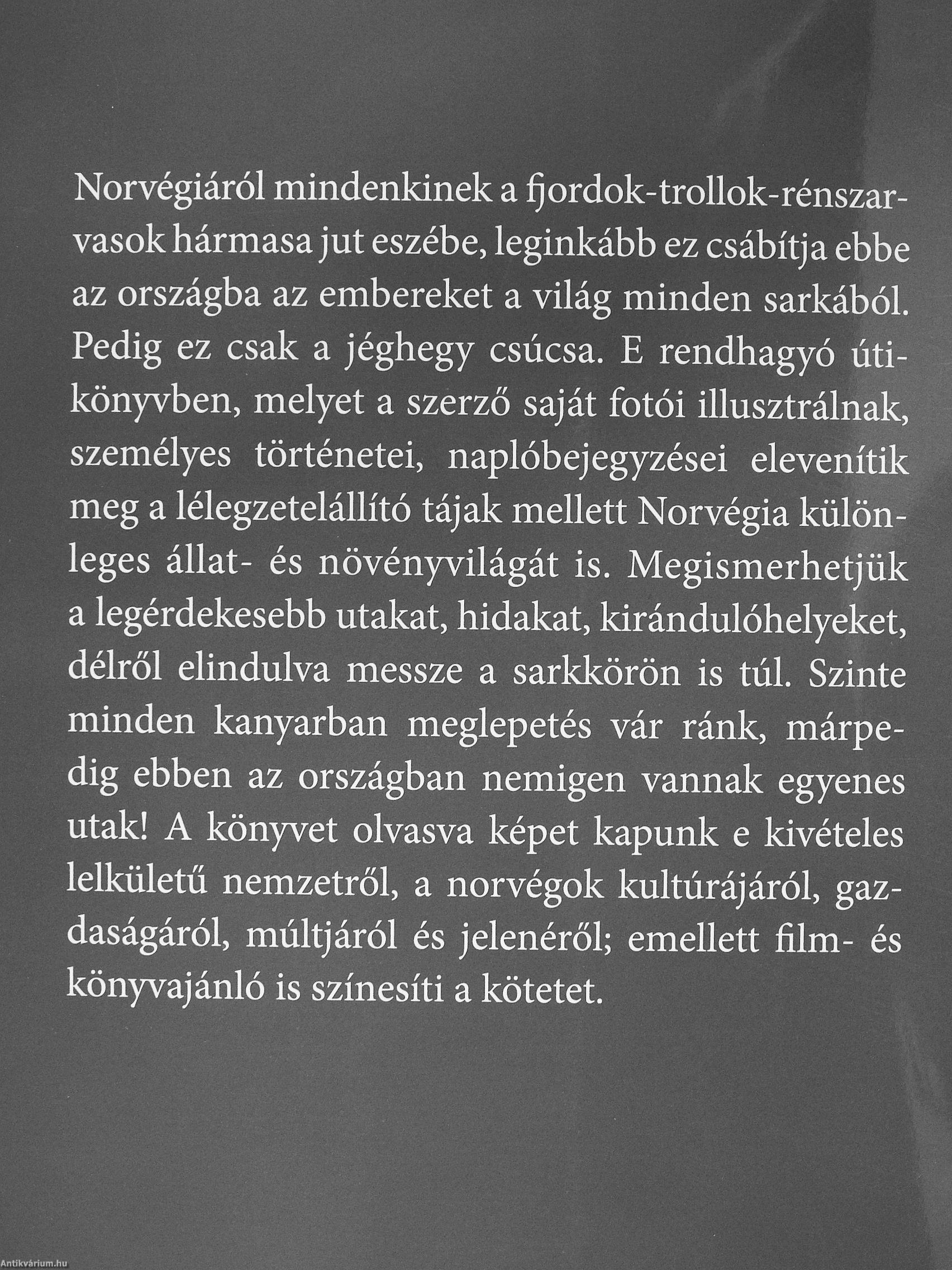 Norvégiáról mindenkinek a ^ordok-trollok-rénszar-vasok hármasa jut eszébe, leginkább ez csábítja ebbe az országba az embereket a világ minden sarkából. Pedig ez csak a jéghegy csúcsa. E rendhagyó útikönyvben, melyet a szerző saját fotói illusztrálnak, személyes történetei, naplóbejegyzései elevenítik meg a lélegzetelállító tájak mellett Norvégia különleges állat- és növényvilágát is. Megismerhetjük a legérdekesebb utakat, hidakat, kirándulóhelyeket, délről elindulva messze a sarkkörön is túl. Szinte minden kanyarban meglepetés vár ránk, márpedig ebben az országban nemigen vannak egyenes utak! A könyvet olvasva képet kapunk e kivételes lelkületű nemzetről, a norvégok kultúrájáról, gazdaságáról, múltjáról és jelenéről; emellett film- és könyvajánló is színesíti a kötetet.