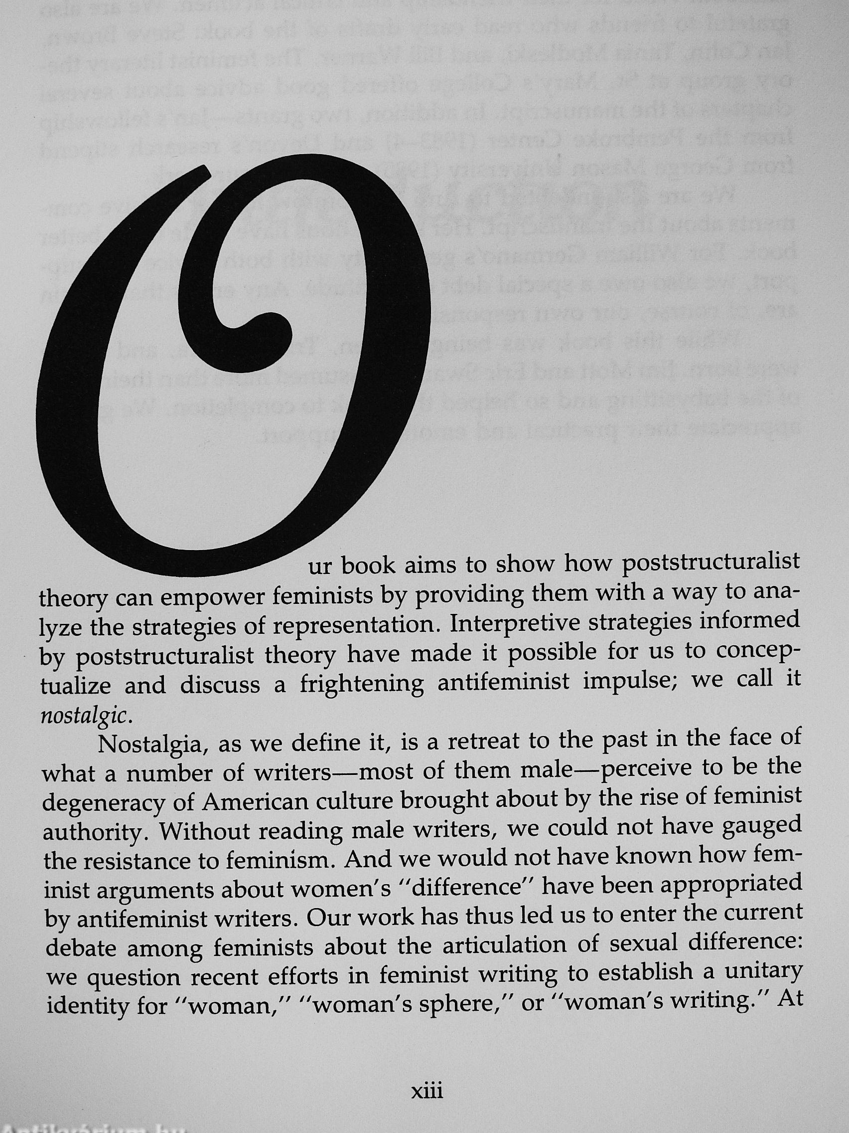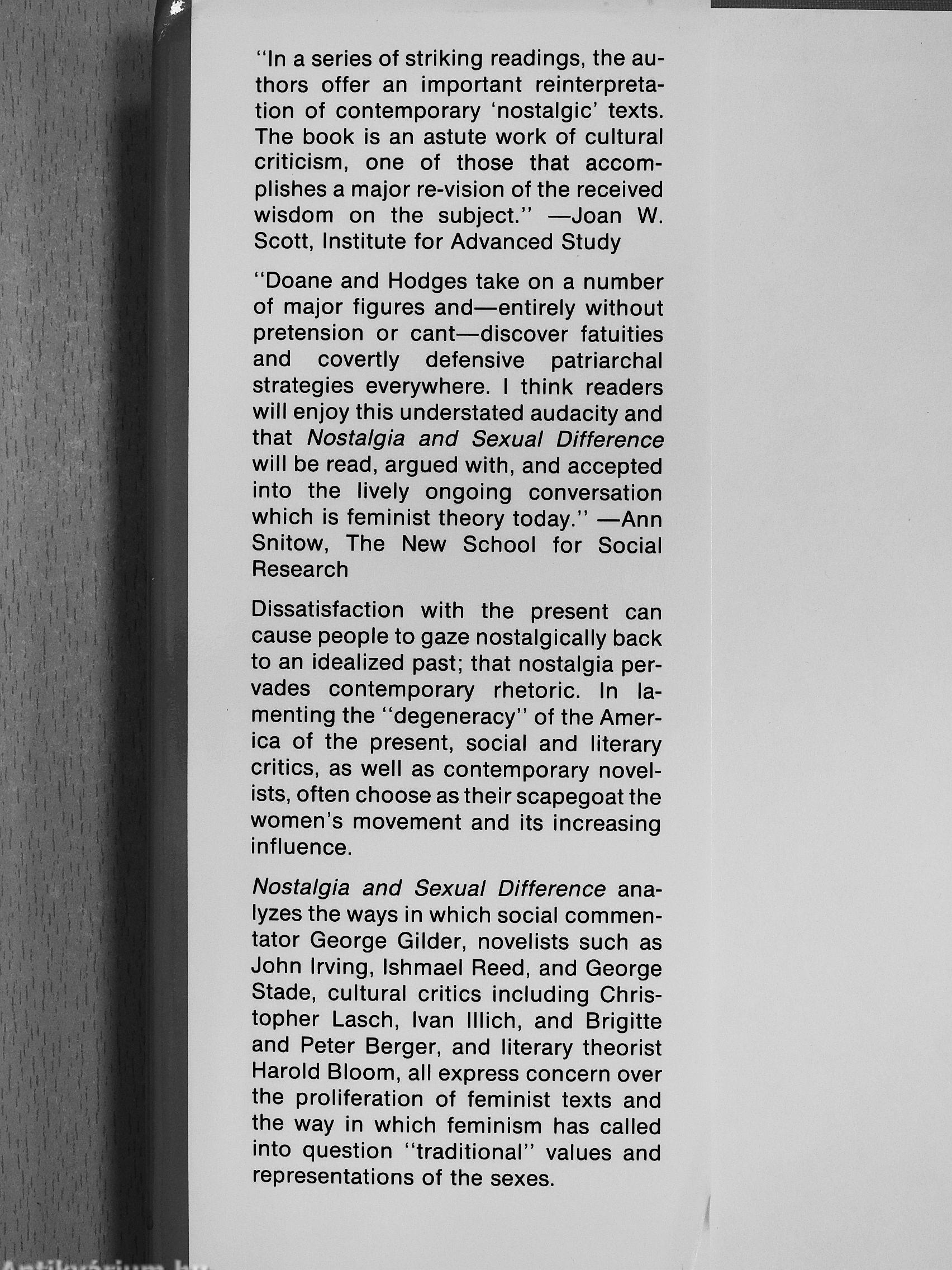 By "nostalgia" Doane and Hodges mean not just a sentimental longing for the past, but a characteristic mode of articulation. In nostalgic writing, the past acts as both a center from which to disparage the present (and the "liberated woman") and as a means of preserving "natural" sexual differences. Yet nostalgic writers are not derogative to feminism in a simple way; often they are sympathetic to those feminists who have emphasized the importance of sexual difference. Nostalgia and Sexual Difference thus demonstrates how a nostalgic turn in recent feminist theory has been appropriated for antifeminist purposes.