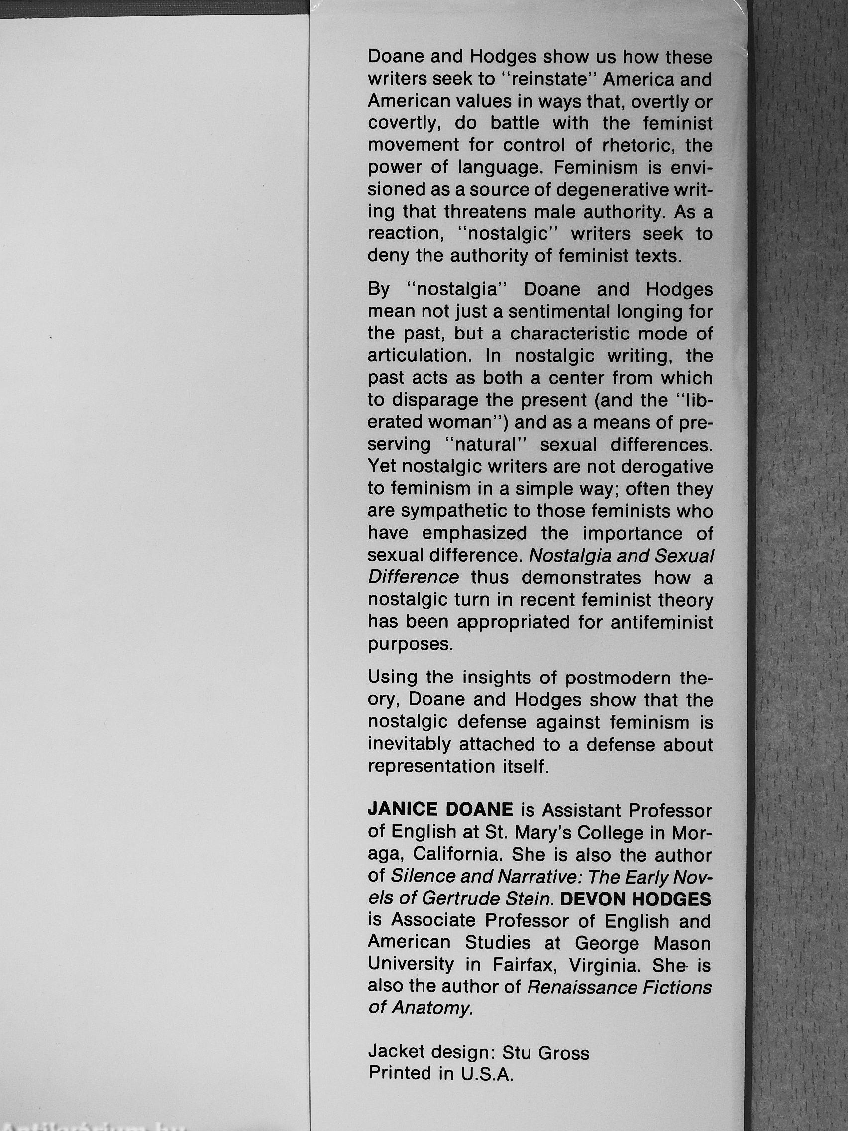 Doane and Hodges show us how these writers seek to "reinstate" America and American values in ways that, overtly or covertly, do battle with the feminist movement for control of rhetoric, the power of language. Feminism is envisioned as a source of degenerative writing that threatens male authority. As a reaction, "nostalgic" writers seek to deny the authority of feminist texts.