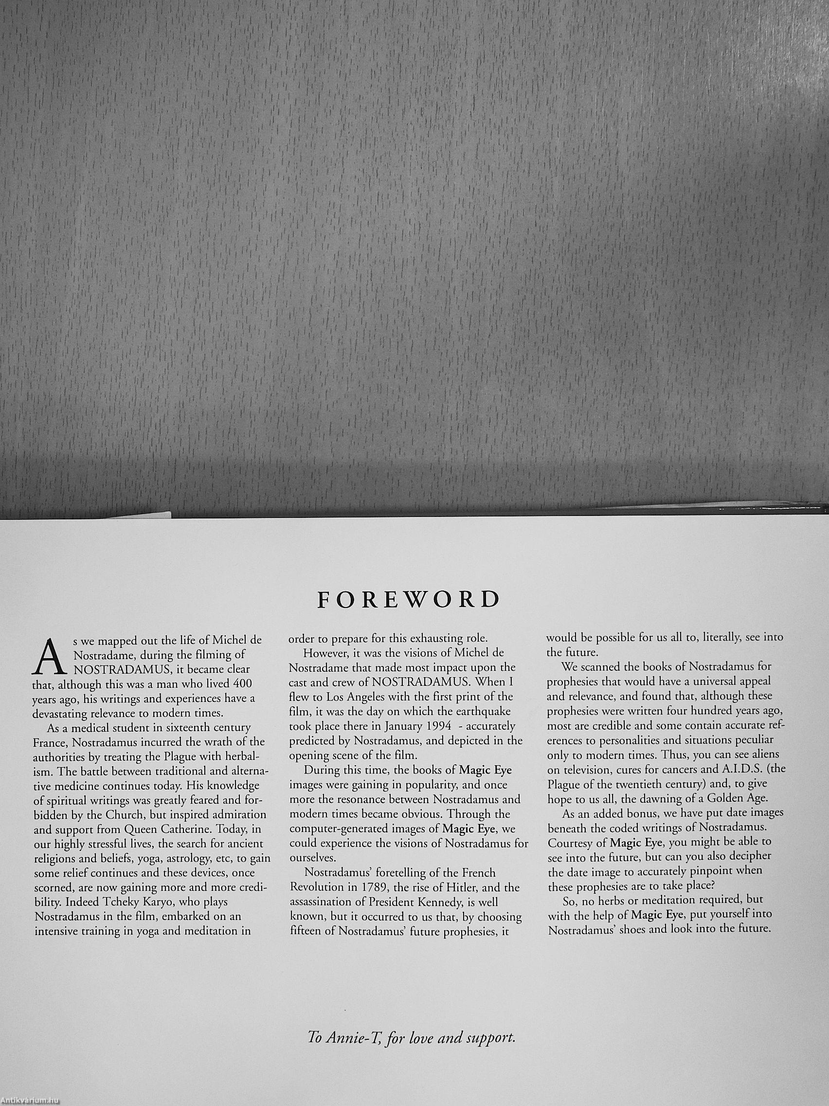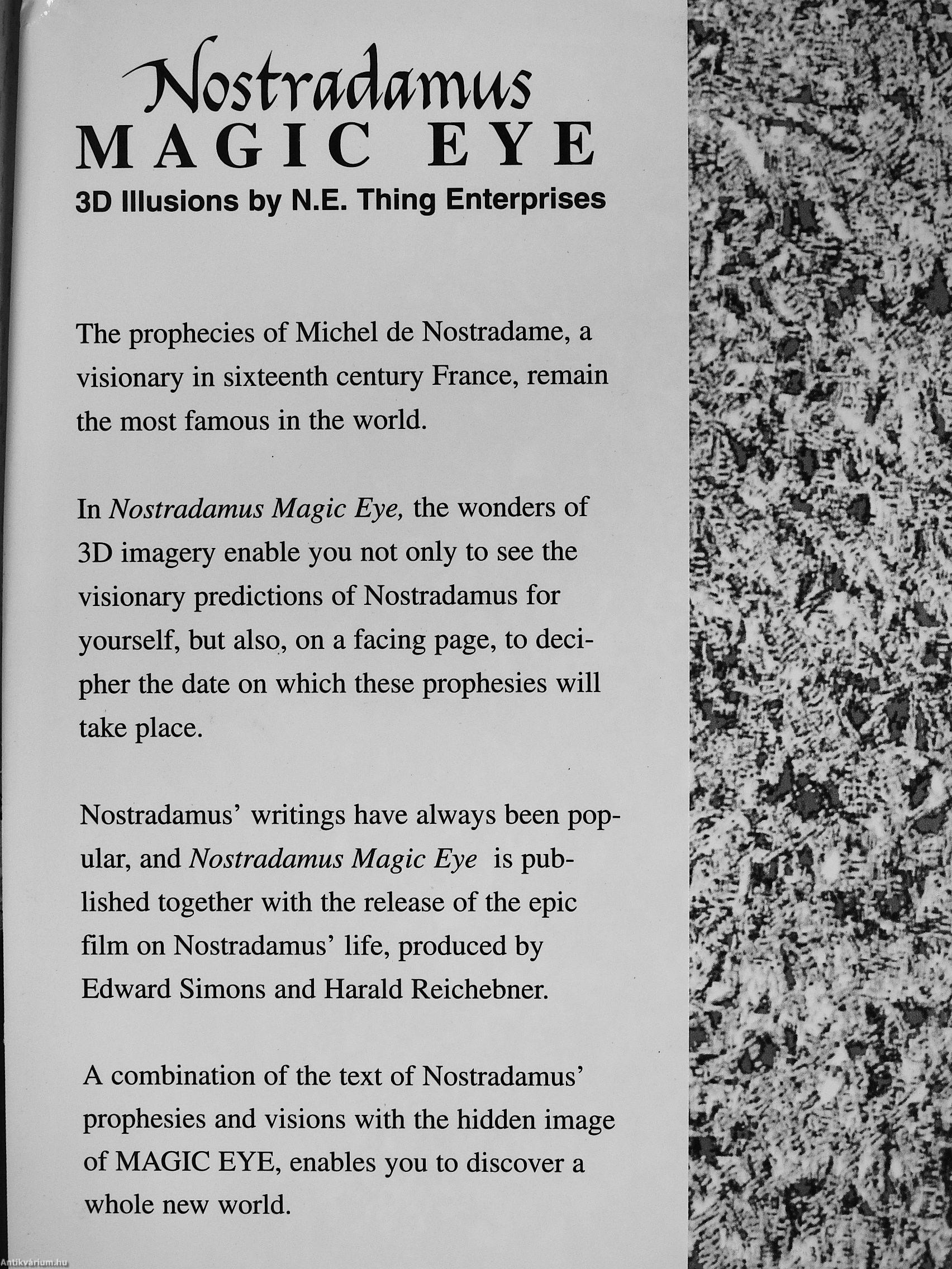 A combination of the text of Nostradamus' prophesies and visions with the hidden image of MAGIC EYE, enables you to discover a whole new world.