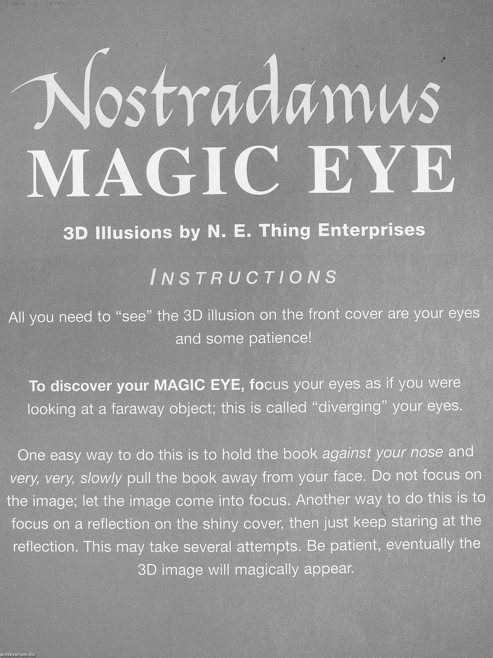 To discover your MAGIC EYE, focus your eyes as if you were looking at a faraway object; this is called "diverging" your eyes.