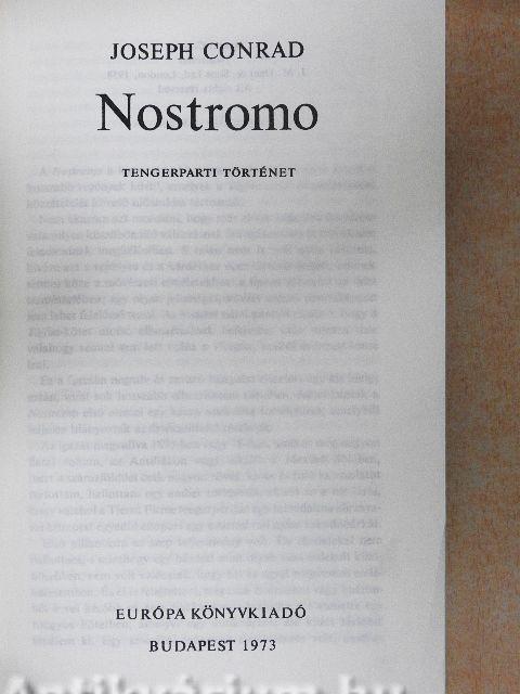 A Nostromo Conradnak talán a legidőtállóbb - mindenesetre a legszínesebb, legizgalmasabb regénye. A történet egy képzeletbeli dél-amerikai országban, Costaguanában játszódik, és rengeteg szereplője van, a legkülönfélébb emberek: spanyolok, olaszok, indiánok, félvérek. De a legfontosabb szereplő talán egy ezüstbánya, amely valóságos mitológiai szörnyként befolyásolja minden ember s az egész ország életét. A szövevényes történet felépítésében Conrad már a XX. századi modern időtechnikát alkalmazza, és hasonlóképpen modern a lélekábrázolás is, amellyel az olasz Nostromo, az angol Gould és a többiek személyiségébe bevilágít.