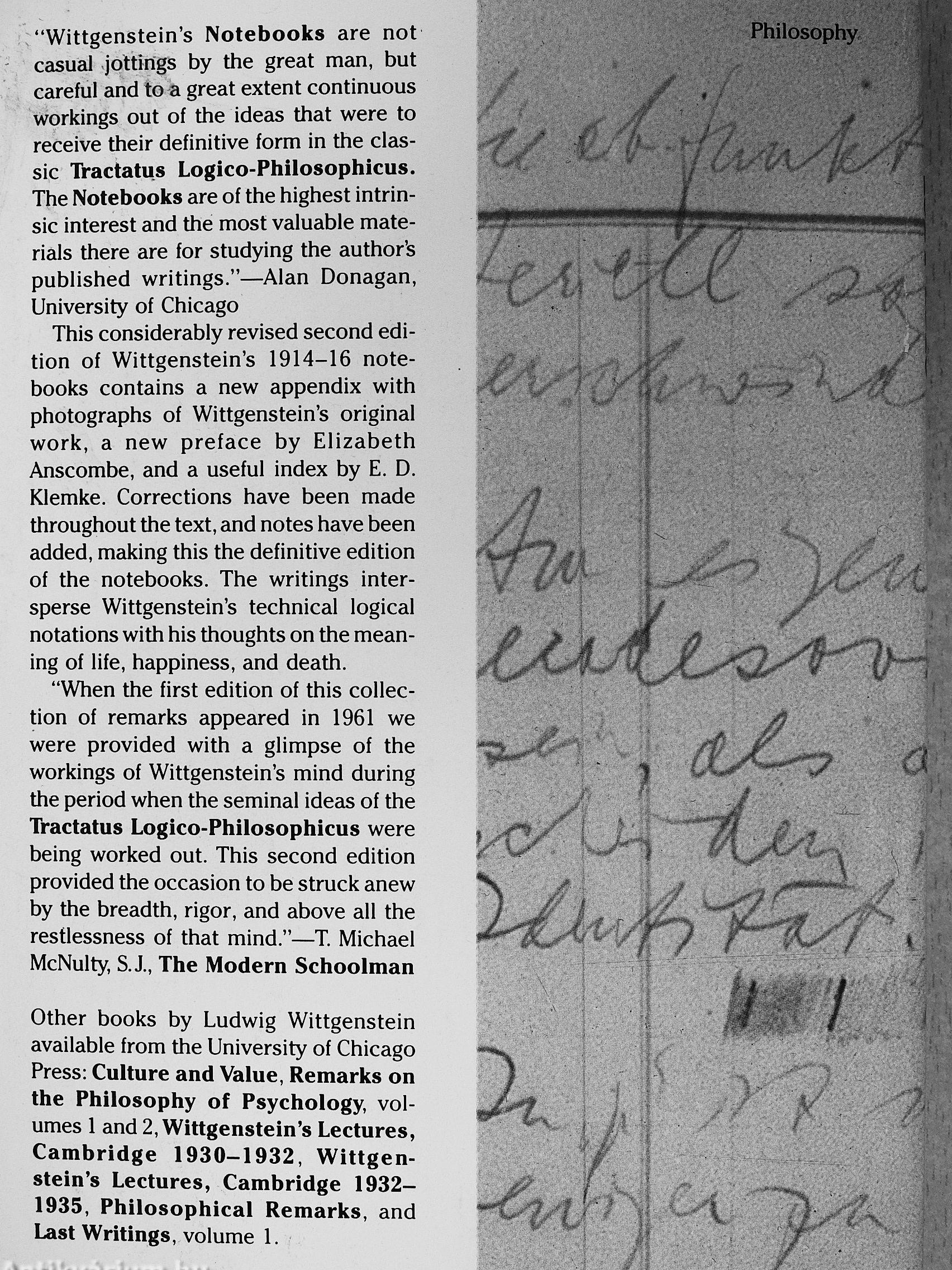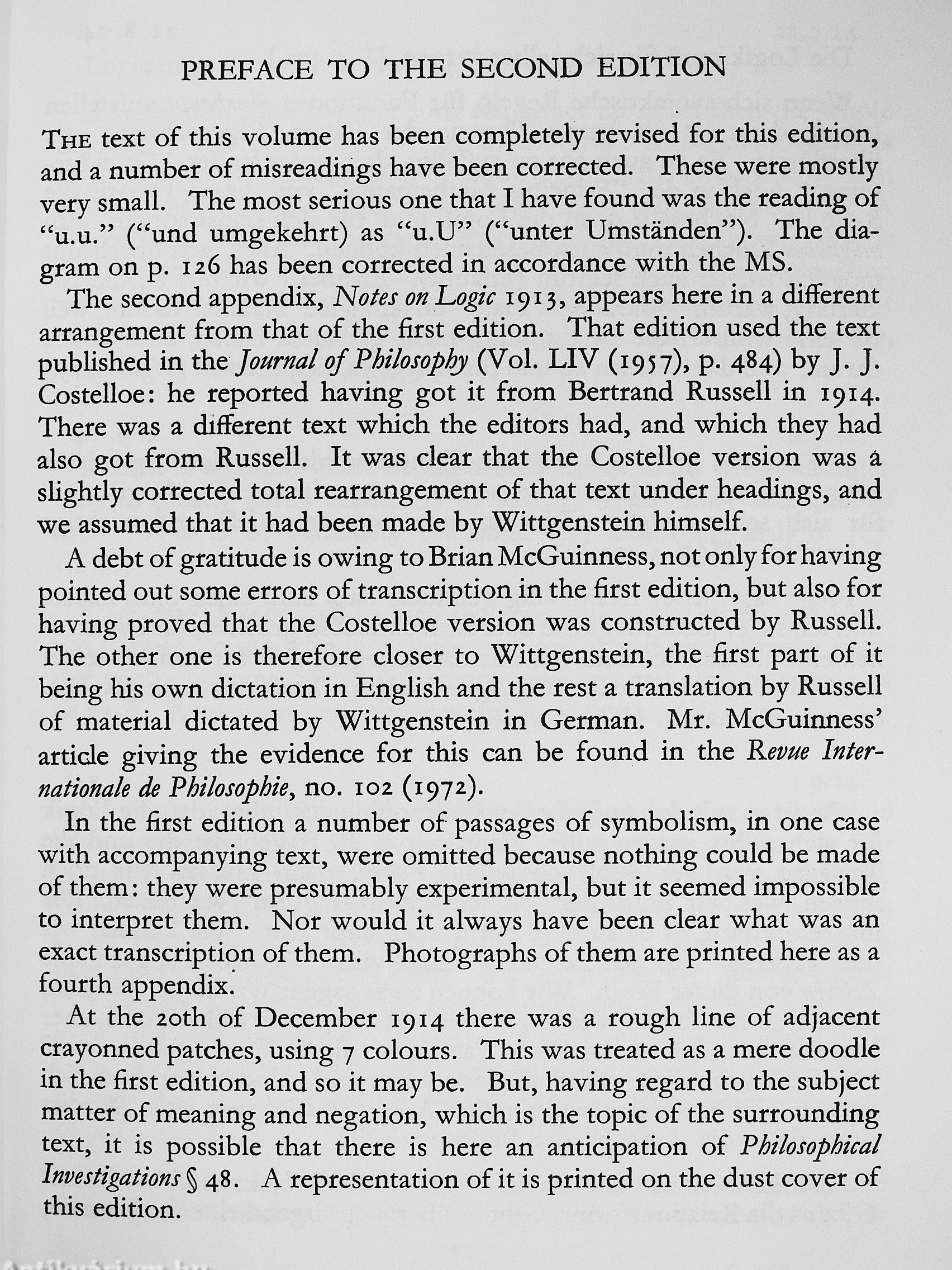 books contains a new appendix with photographs of Wittgenstein's original work, a new preface by Elizabeth Anscombe, and a useful index by E. D. Klemke. Corrections have been made ;