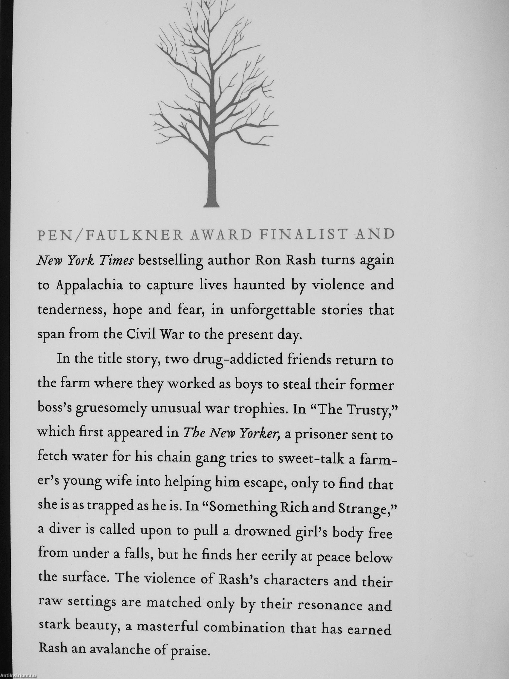 In the title story, tvsro drug-addicted friends return to the farm w^here they w^orked as boys to steal their former boss's gruesomely unusual war trophies. In "The Trusty," vv^hich first appeared in The Nen/ Yorker, a prisoner sent to fetch vv^ater for his chain gang tries to sweet-talk a farmer's young wife into helping him escape, only to find that she is as trapped as he is. In "Something Rich and Strange," a diver is called upon to pull a drowned girl's body free from under a falls, but he finds her eerily at peace below the surface. The violence of Rash's characters and their raw settings are matched only by their resonance and stark beauty, a masterful combination that has earned Rash an avalanche of praise.