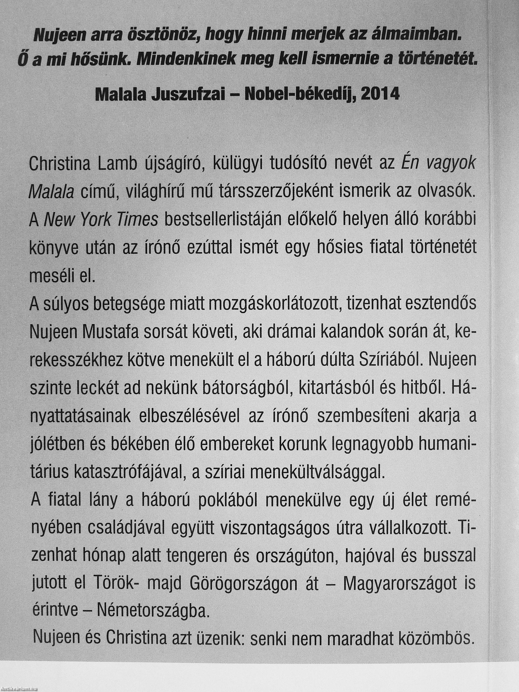 A súlyos betegsége miatt mozgáskorlátozott, tizenhat esztendős Nujeen Mustafa sorsát követi, aki drámai kalandok során át, kerekesszékhez kötve menekült el a háború dúlta Szíriából. Nujeen szinte leckét ad nekünk bátorságból, kitartásból és hitből. Hányattatásainak elbeszélésével az írónő szembesíteni akarja a jólétben és békében élő embereket korunk legnagyobb humanitárius katasztrófájával, a szíriai menekültválsággal. A fiatal lány a háború poklából menekülve egy új élet reményében családjával együtt viszontagságos útra vállalkozott. Tizenhat hónap alatt tengeren és országúton, hajóval és busszal jutott el Török- majd Görögországon át - Magyarországot is érintve - Németországba.