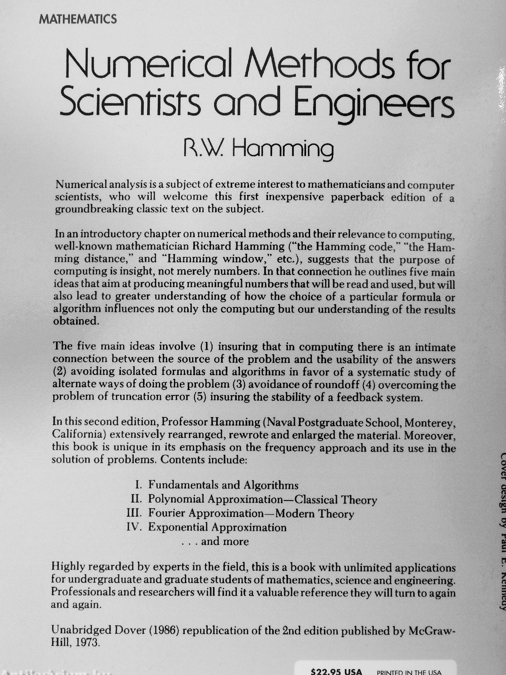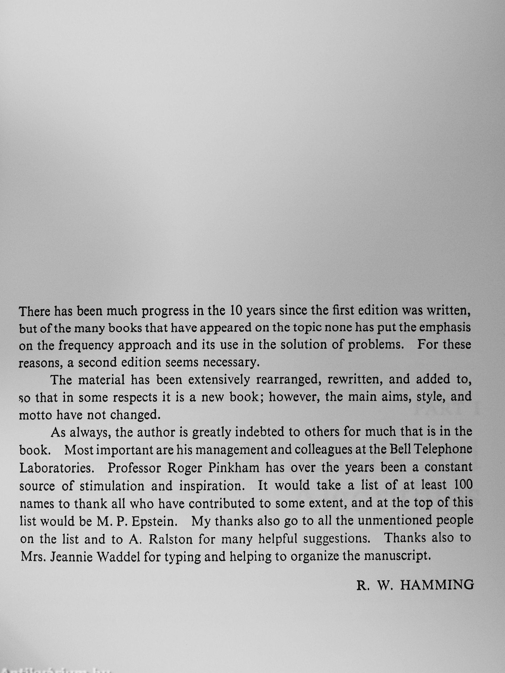 In this second edition, Professor Hamming (Naval Postgraduate School, Monterey, California) extensively rearranged, rewrote and enlarged the material. Moreover, this book is unique in its emphasis on the frequency approach and its use in the solution of problems. Contents include: