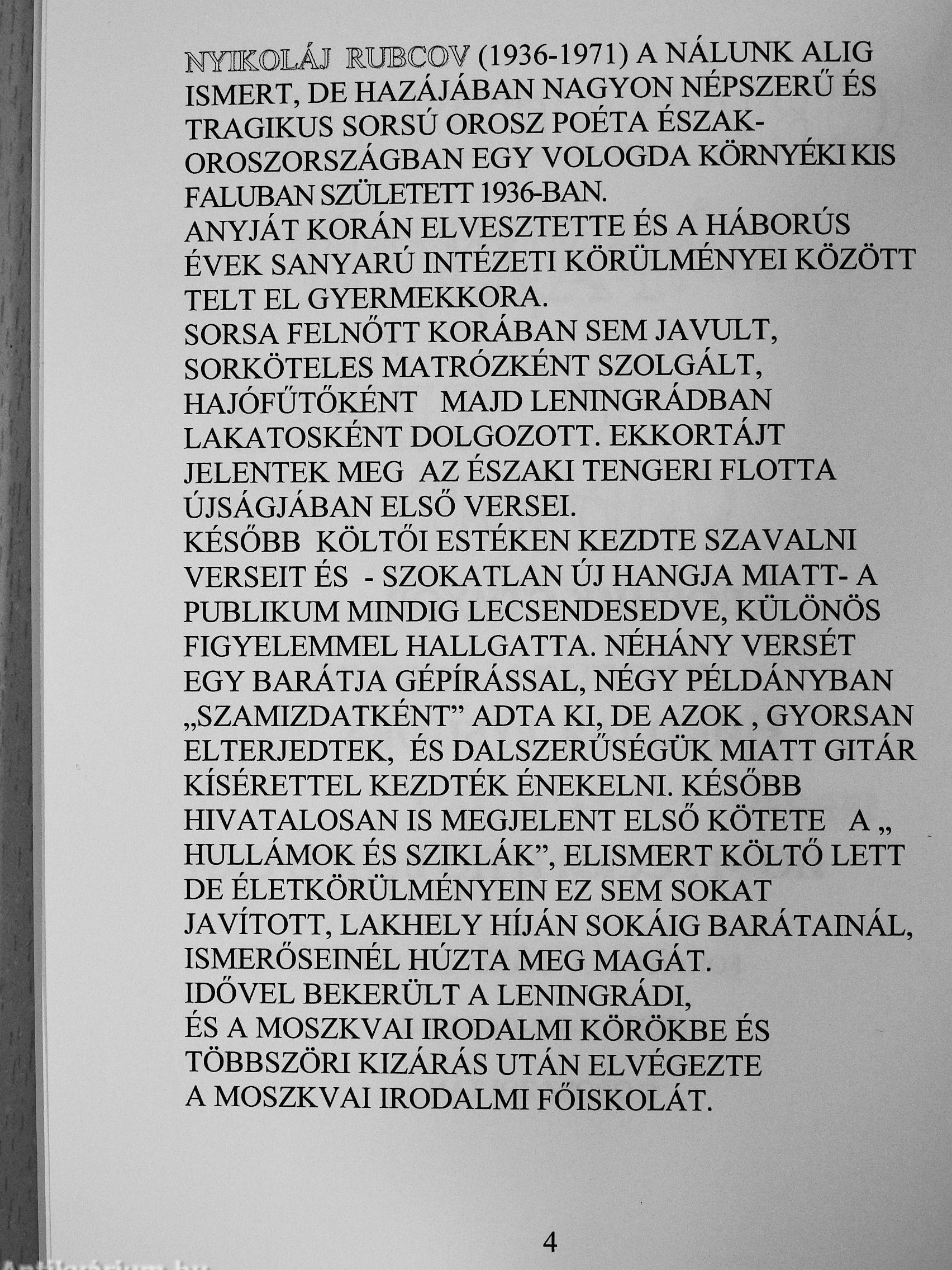 Nyikolaj Rubcov műveinek az Antikvarium.hu-n kapható vagy előjegyezhető listáját itt tekintheti meg: Nyikolaj Rubcov könyvek, művek