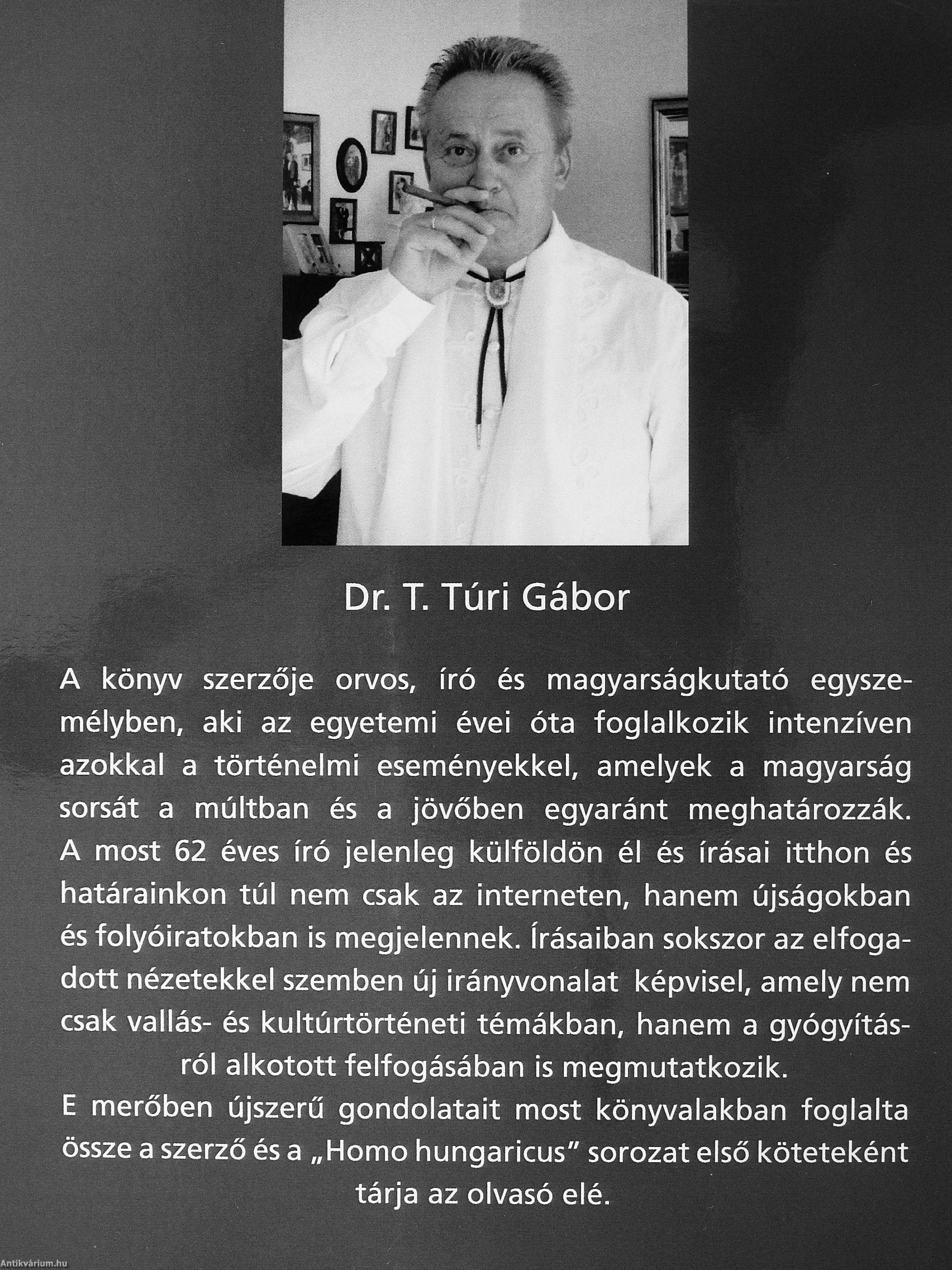 A könyv szerzője orvos, író és magyarságkutató egysze-mélyben, aki az egyetemi évei óta foglalkozik intenzíven azokkal a történelmi eseményekkel, amelyek a magyarság sorsát a múltban és a jövőben egyaránt meghatározzák. A most 62 éves író jelenleg külföldön él és írásai itthon és határainkon túl nem csak az interneten, hanem újságokban és folyóiratokban is megjelennek. írásaiban sokszor az elfogadott nézetekkel szemben új irányvonalat képvisel, amely nem csak vallás- és kultúrtörténeti témákban, hanem a gyógyításról alkotott felfogásában is megmutatkozik. E merőben újszerű gondolatait most könyvalakban foglalta össze a szerző és a „Homo hungaricus" sorozat első köteteként