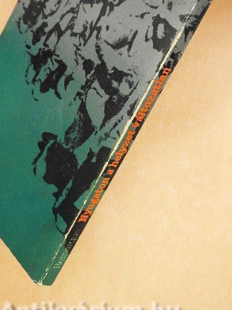 Erich Maria Remarque 1898-ban született, s a tanárképző padjából került az első világháborúba. Húszéves korában szerelt le. Ő és társai, akikkel egyszerre vonult be, semmi egyebet nem láttak a világból, csak az iskolát és a frontot. A Nyugaton a helyzet változatlan az ő szenvedéseik és kiábrándulásuk története. Hőse, Paul Baumer, csak apró vonásokban különbözik társaitól. A lövészárok élete nagyjából egyforma emberekké gyúrja őket. A front iszonyata mindent kiéget belőlük, egyetlen erényük, egyetlen kincsük marad: a bajtársiasság. Megrázóan igaz, őszinte írás ez a regény. Óriási sikerét kétségtelen értékei mellett annak is köszönhette, hogy megjelenésekor már szükséges volt a belőle harsogó figyelmeztetés: íme, valójában ez a háború, vigyázzatok, nehogy újra belesodorjanak benneteket! Hiszen ekkoriban egy müncheni sörház asztalai mellet t már a második világháború sikerére isznak az osztrák káplár hívei. De ami ebben a sodró lendületű regényben a humánum magas hőfokán megfogalmazódik, ma is eleven problémája az emberiségnek, s még sokáig nem veszíti érvényét.