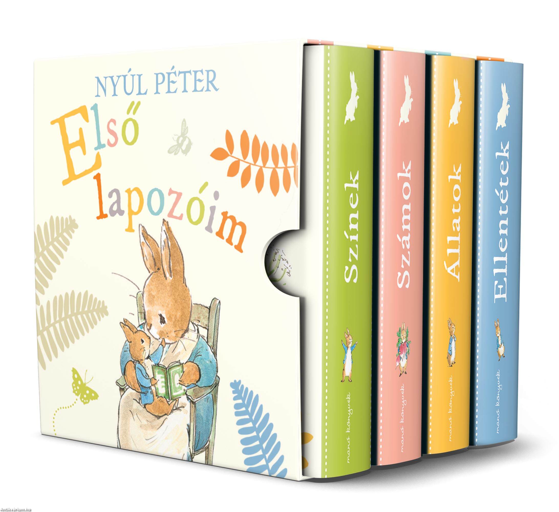 Négy kis lapozó egy dobozban a Nyúl Péter és barátaiból jól ismert illusztrációkkal a legkisebbeknek.