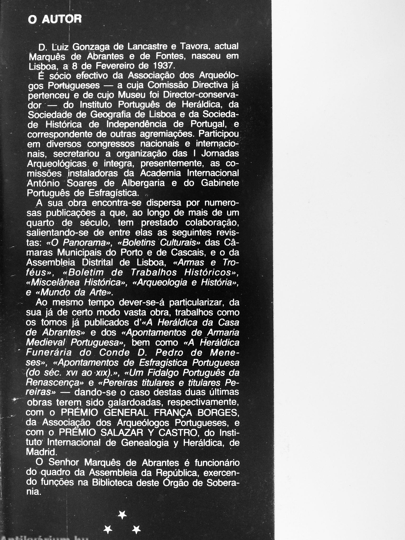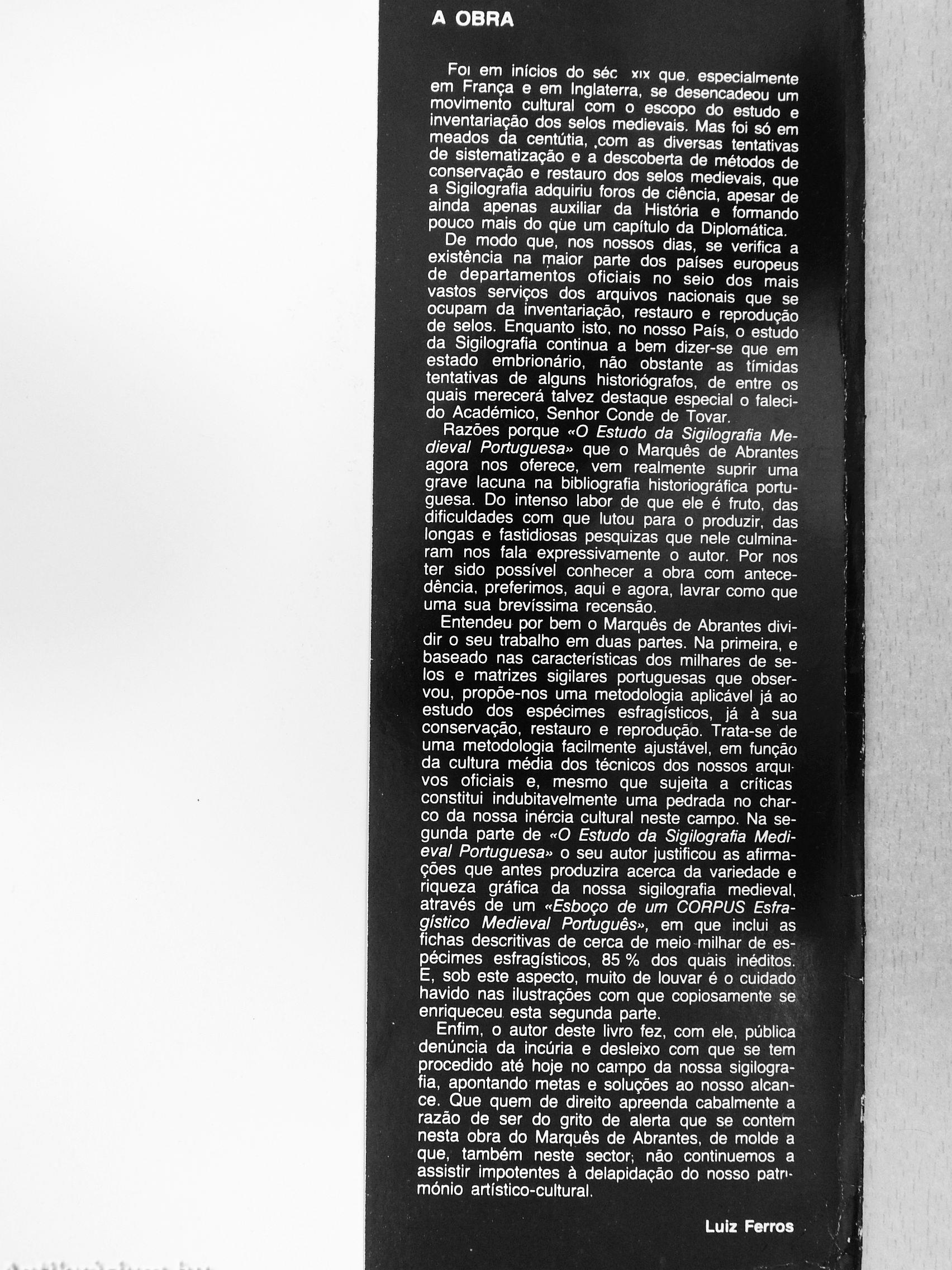 Enfim, 0 autor deste livro fez, com ele, pública denúncia da incuria e desleixo com que se tem procedido até hoje no campo da nossa sigilografía, apontando metas e soluçôes ao nosso alcance. Que quem de díreíto apreenda cabalmente a razâo de ser do grito de alerta que se contem nesta obra do Marqués de Abrantes, de molde a que, também neste sector; náo continuemos a assistir Impotentes a delapidaçao do nosso patn-mónlo artístíco-cultural.