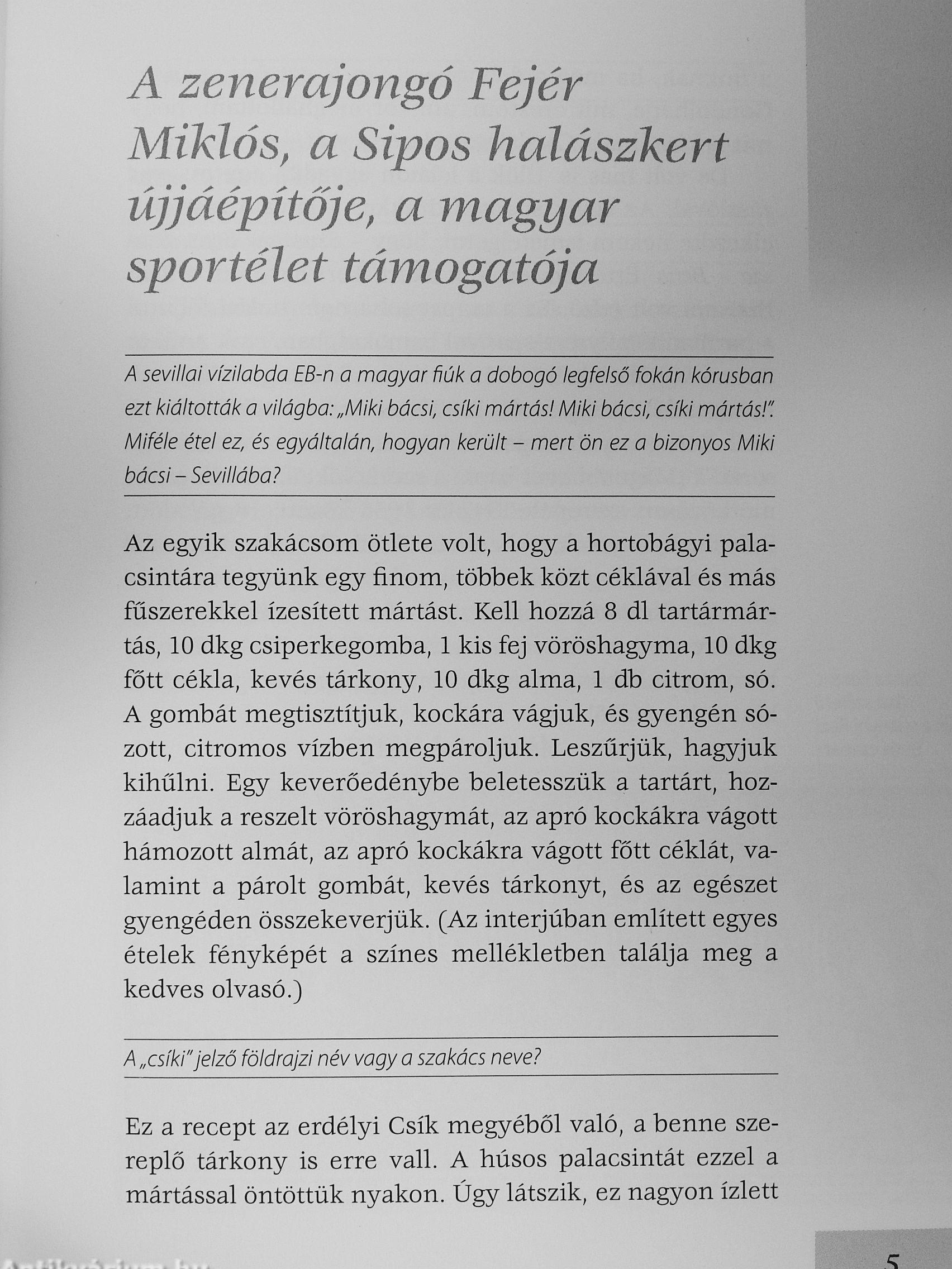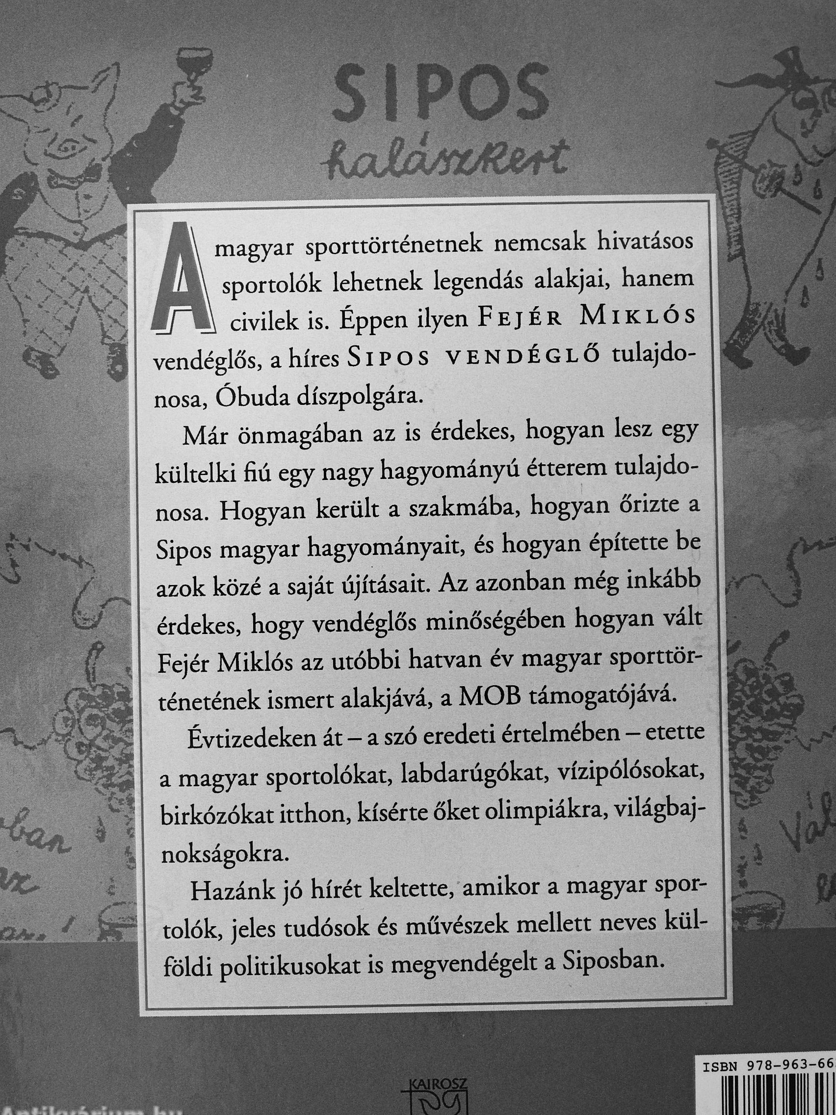 Már önmagában az is érdekes, hogyan lesz egy kültelki fiú egy nagy hagyományú étterem tulajdonosa. Hogyan került a szakmába, hogyan őrizte a Sipos magyar hagyományait, és hogyan építette be azok közé a saját újításait. Az azonban még inkább érdekes, hogy vendéglős minőségében hogyan vált Fejér Miklós az utóbbi hatvan év magyar sporttörténetének ismert alakjává, a MOB támogatójává.