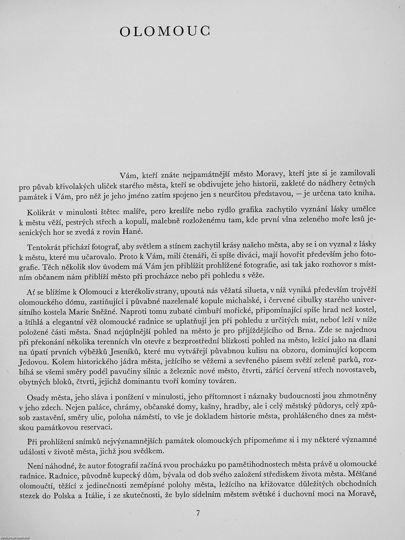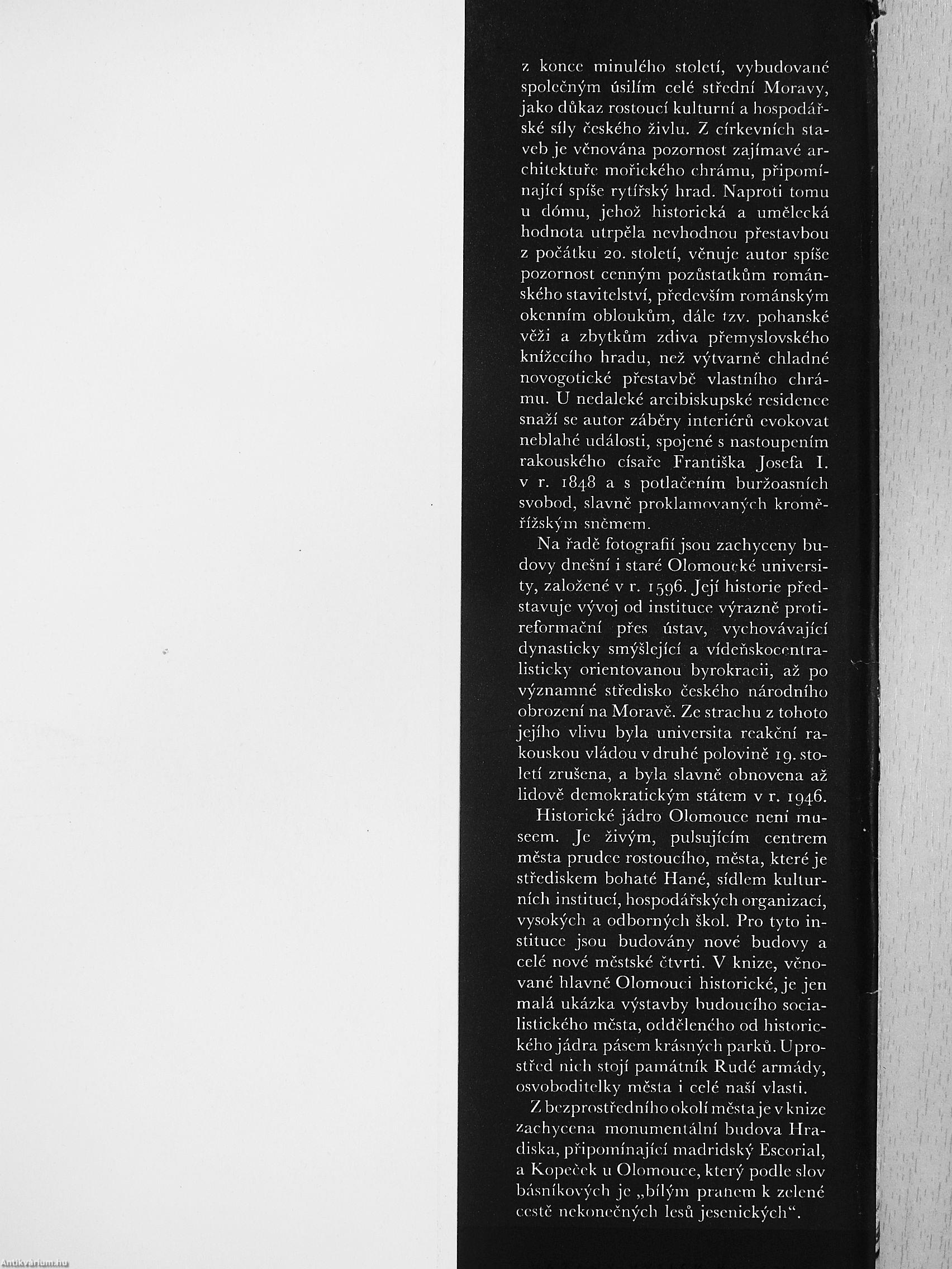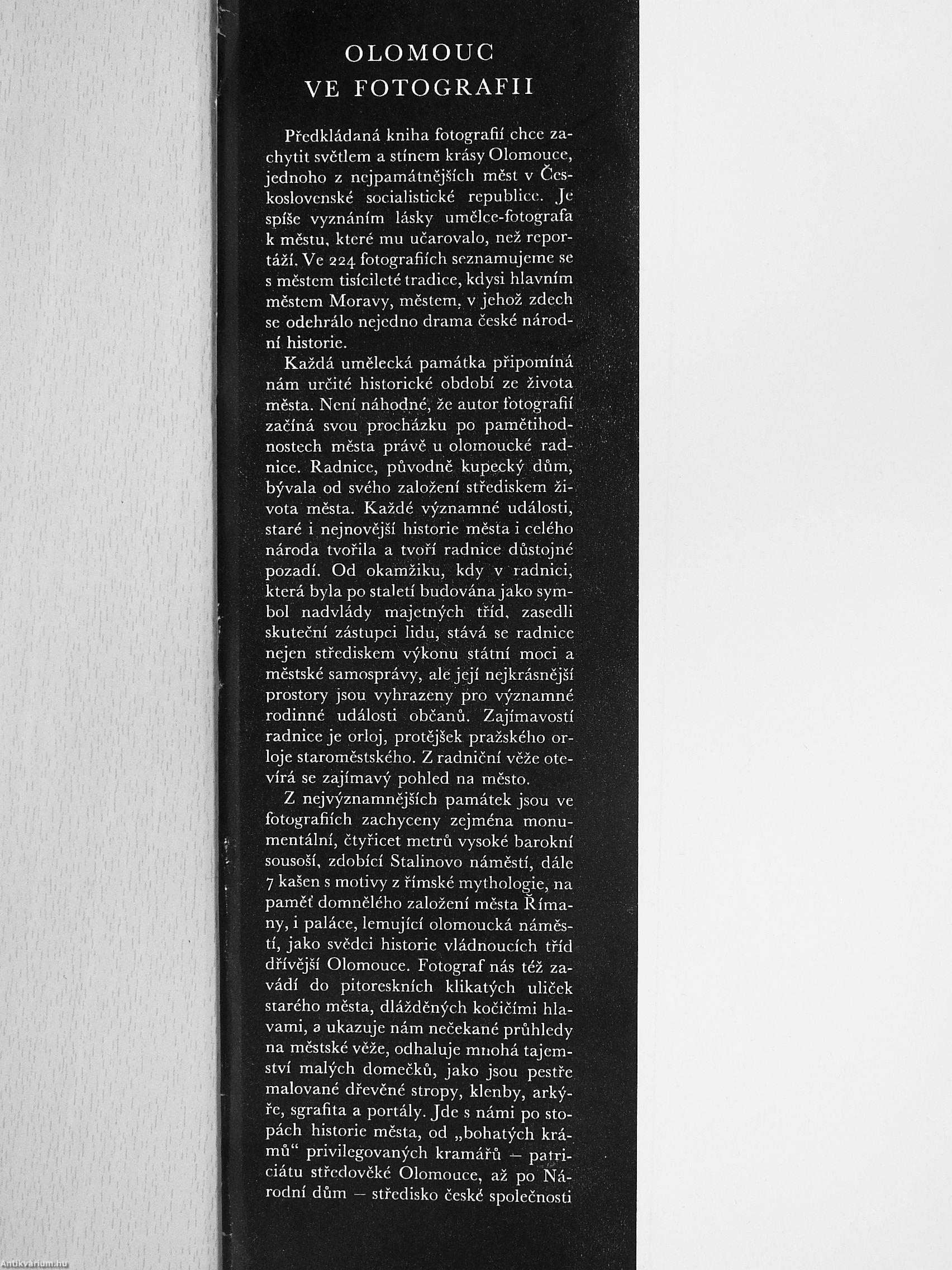 Pfcdkládaná kniha fotografií chce za-chytit svctlem a stínem krásy Olomouce, jednoho z ncjpamátnéjSi'ch mcsl v Ccs-koslovcnské socialistické republici-. Je spí§e vyznáním lásky umclce-fotografa k méstu, ktcré mu ucarovalo, nez rcpor-tázi. Ve 224 fotografiích scznamujeme se s méstcm tisícilcté tradice, kdysi hlavním mcstcm Moravy, méstcm, v jehoz zdech se odehrálo nejcdno drama ceské národ-ní historie.