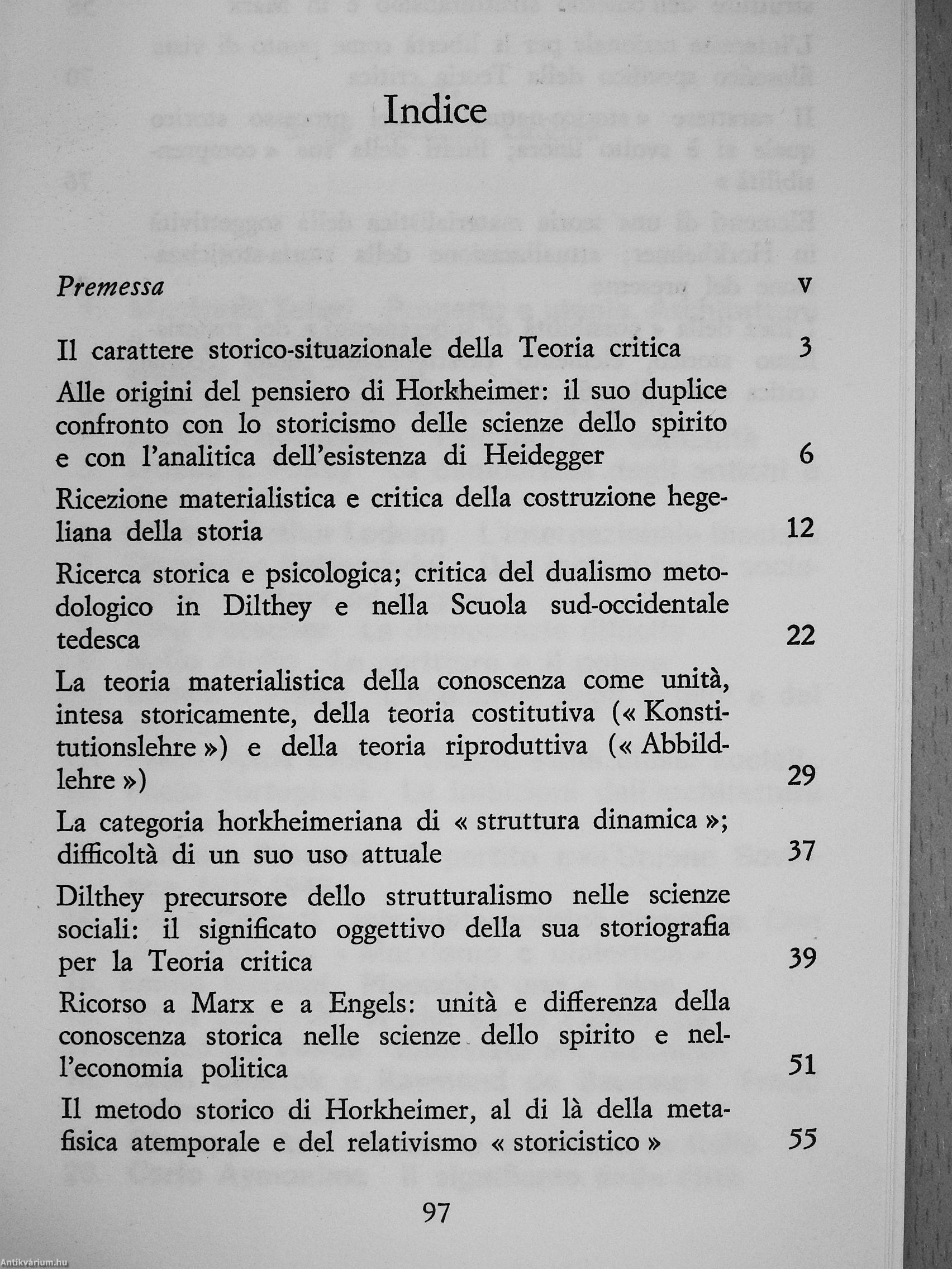 Che cos'e la storia? procede seconde fini preordinati anche se occulti, oppure e aperta al libero intervento umano? quale posto e quali possibilitá ha in essa Tindividuo? Nel chiarire le posizioni dei principali pensatori della Scuola di Francoforte — Max Horkheimer, Theodor W. Adorno, Jürgen Habermas — Alfred Schmidt le mette in rapporte con le principali teorie della storia dell'eta contemporánea — da Kant e Hegel alla fenomenología di Husserl, da Heidegger alio strutturalismo — fino al confronto polémico con Althusser e con la sua tesi di una « storia senza soggetto ».