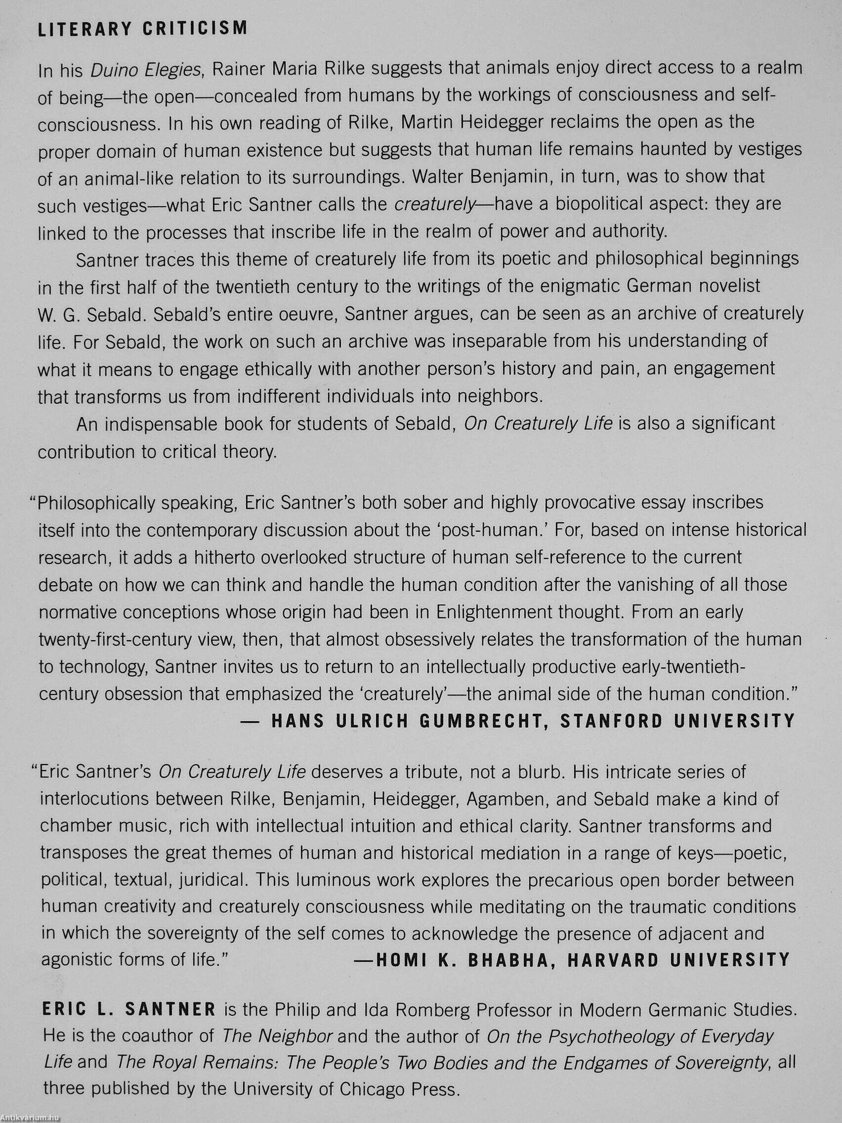 "Philosophically speaking, Eric Santner's both sober and highly provocative essay inscribes itself into the contemporary discussion about the 'post-human.' For, based on intense historical research, it adds a hitherto overlooked structure of human self-reference to the current debate on how we can think and handle the human condition after the vanishing of all those normative conceptions whose origin had been in Enlightenment thought. From an early twenty-first-century view, then, that almost obsessively relates the transformation of the human to technology, Santner invites us to return to an intellectually productive early-twentieth-century obsession that emphasized the 'creaturely'—the animal side of the human condition."