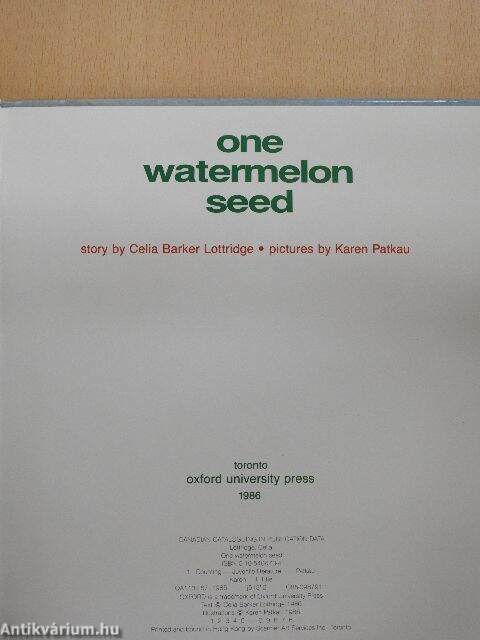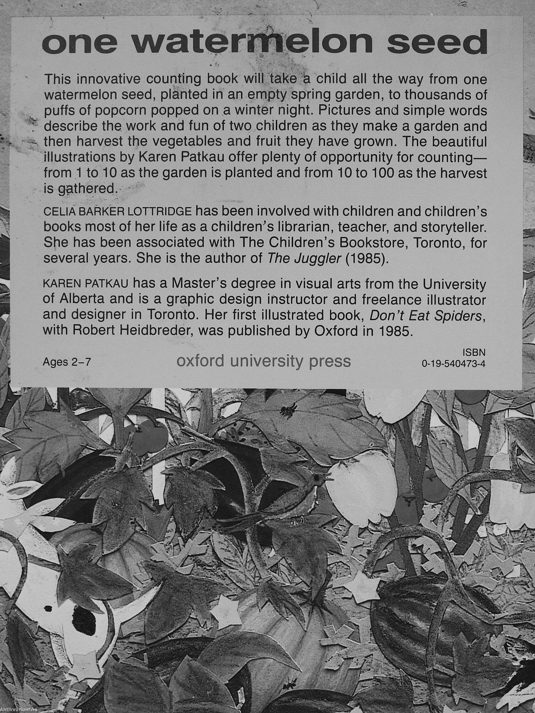 This innovative counting book will take a child all the way from one watermelon seed, planted in an empty spring garden, to thousands of puffs of popcorn popped on a winter night. Pictures and simple words describe the work and fun of two children as they make a garden and then harvest the vegetables and fruit they have grown. The beautiful illustrations by Karen Patkau offer plenty of opportunity for counting— from 1 to 10 as the garden is planted and from 10 to 100 as the harvest is gathered.