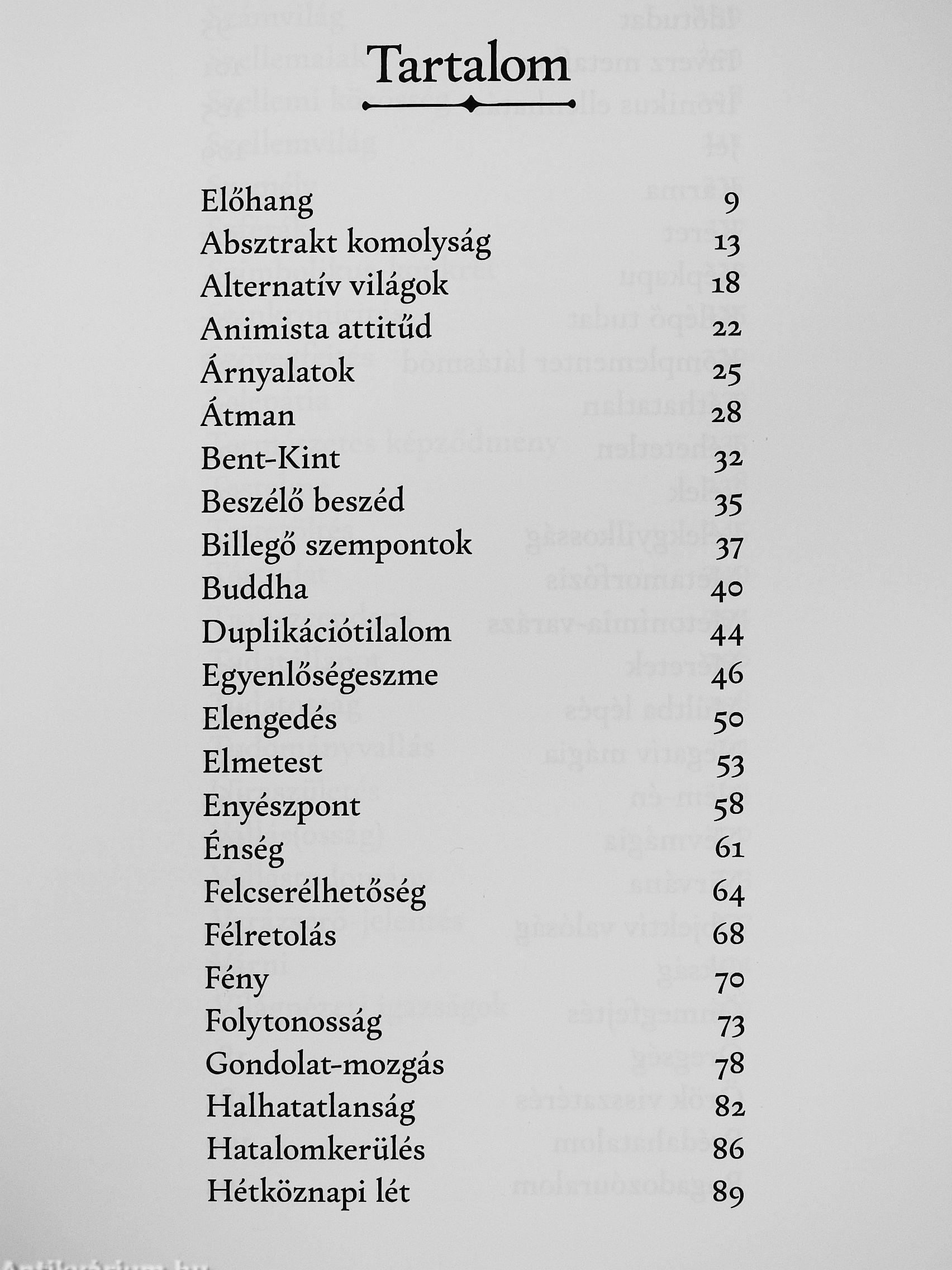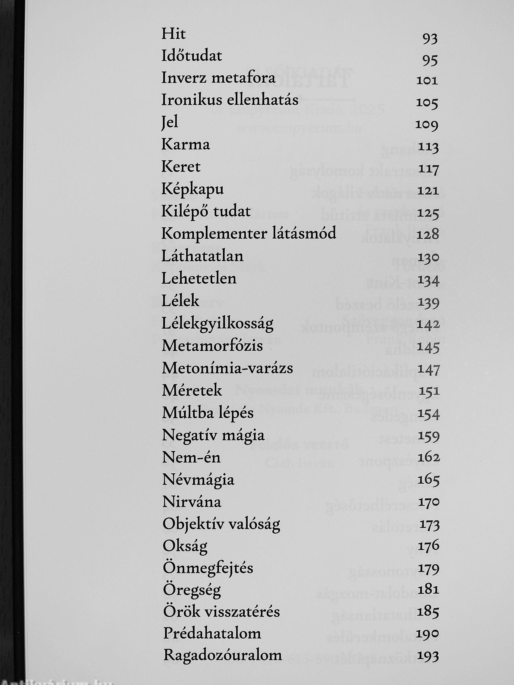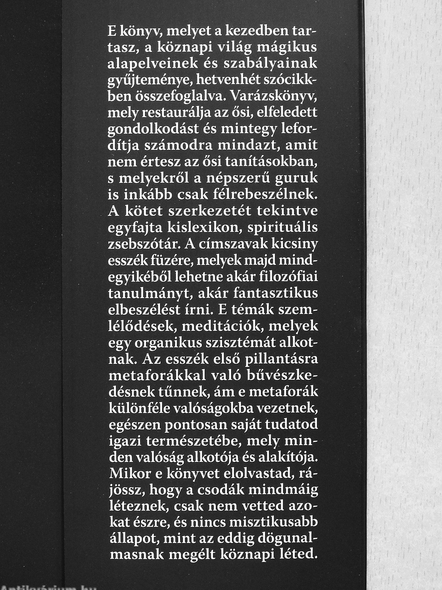 E könyv, melyet a kezedben tartasz, a köznapi világ mágikus alapelveinek és szabályainak gyűjteménye, hetvenhét szócikkben összefoglalva. Varázskönyv, mely restaurálja az ősi, elfeledett gondolkodást és mintegy lefordítja számodra mindazt, amit nem értesz az ősi tanításokban, s melyekről a népszerű guruk is inkább csak félrebeszélnek. A kötet szerkezetét tekintve egyfajta kislexikon, spirituális zsebszótár. A címszavak kicsiny esszék füzére, melyek majd mindegyikéből lehetne akár filozófiai tanulmányt, akár fantasztikus elbeszélést írni. E témák szemlélődések, meditációk, melyek egy organikus szisztémát alkotnak. Az esszék első pillantásra metaforákkal való bűvészkedésnek tűnnek, ám e metaforák különféle valóságokba vezetnek, egészen pontosan saját tudatod igazi természetébe, mely minden valóság alkotója és alakítója. Mikor e könyvet elolvastad, rájössz, hogy a csodák mindmáig léteznek, csak nem vetted azokat észre, és nincs misztikusabb állapot, mint az eddig dögunalmasnak megélt köznapi léted.