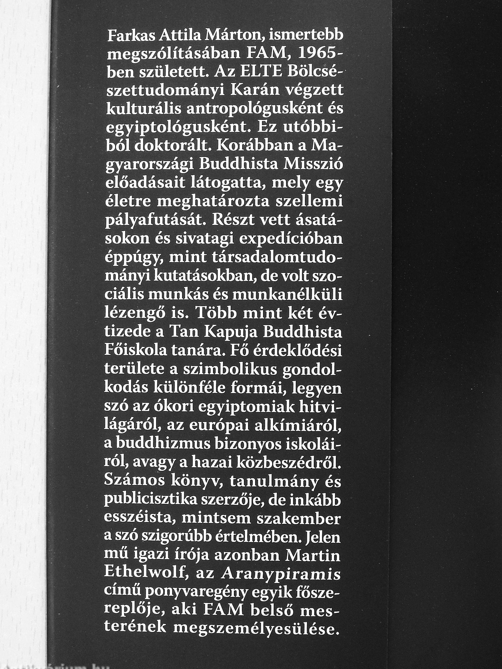 Farkas Attila Márton, ismertebb megszólításában FAM, 1965-ben született. Az ELTE Bölcsészettudományi Karán végzett kulturális antropológusként és egyiptológusként. Ez utóbbiból doktorált. Korábban a Magyarországi Buddhista Misszió előadásait látogatta, mely egy életre meghatározta szellemi pályafutását. Részt vett ásatásokon és sivatagi expedícióban éppúgy, mint társadalomtudományi kutatásokban, de volt szociális munkás és munkanélküli lézengő is. Több mint két évtizede a Tan Kapuja Buddhista Főiskola tanára. Fő érdeklődési területe a szimbolikus gondolkodás különféle formái, legyen szó az ókori egyiptomiak hitvilágáról, az európai alkímiáról, a buddhizmus bizonyos iskoláiról, avagy a hazai közbeszédről. Számos könyv, tanulmány és publicisztika szerzője, de inkább esszéista, mintsem szakember a szó szigorúbb értelmében. Jelen mű igazi írója azonban Martin Ethelwolf, az Aranypiramís című ponyvaregény egyik főszereplője, aki FAM belső mesterének megszemélyesülése.