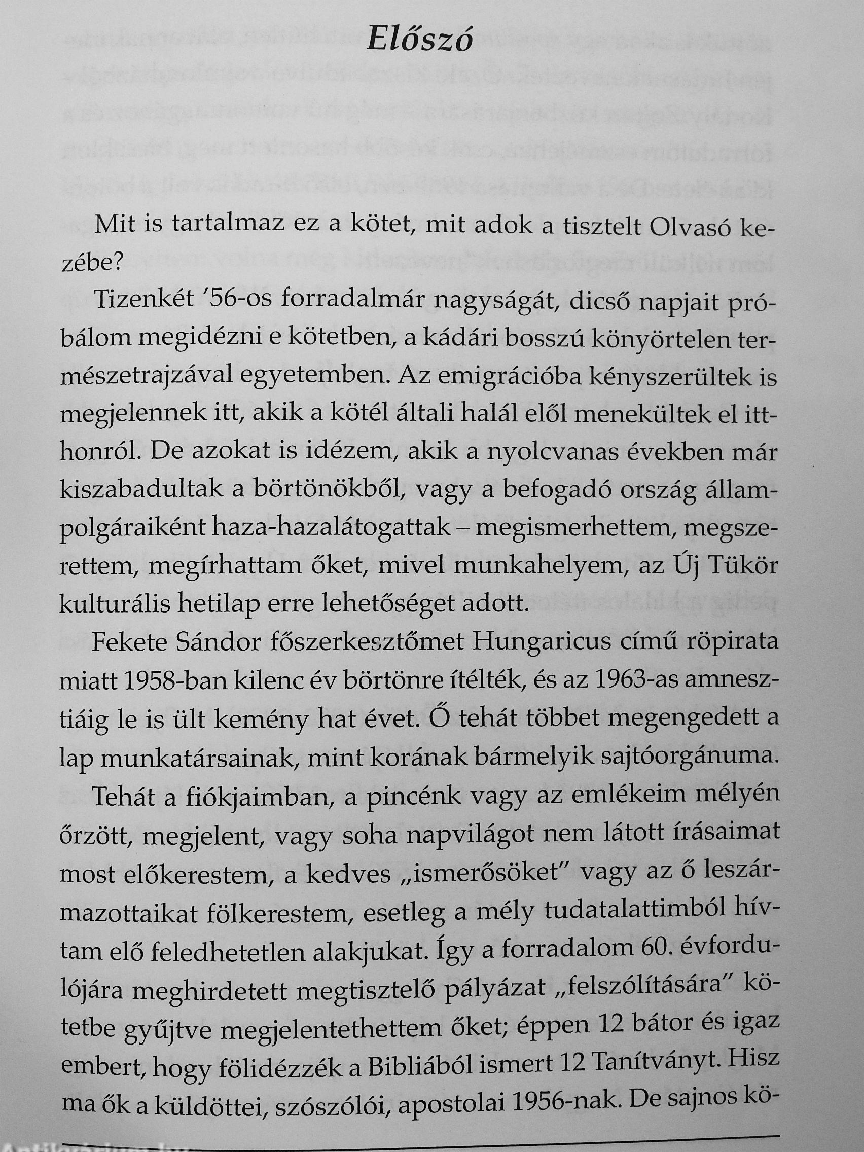 Belémivódott egy életre a világraszóló 1956-os magyar forradalom, meghatározta mindenkori magatartásomat, a lehangoló magyar valósággal szemben is. Mondhatni vigasztalóan hatott rám az emlék: Hogy mire nem volt képes ez a nép!! Kicsit a hétköznapjaimat igazgatta a tudatalattiból, ahová befészkelte magát. S nemcsak azért, mert az „ellenforradalmár" bélyeggel engem is elláttak; nem engedtek egyetemre és kirúgtak az óraadó-tanítói állásomból. A fővárostól több száz kilométerre, a Viharsarok kis falujában megrendülten éltem át a rádióból sugárzott, végtelenül izgalmas és százszor megkönnyezett eseményeket.