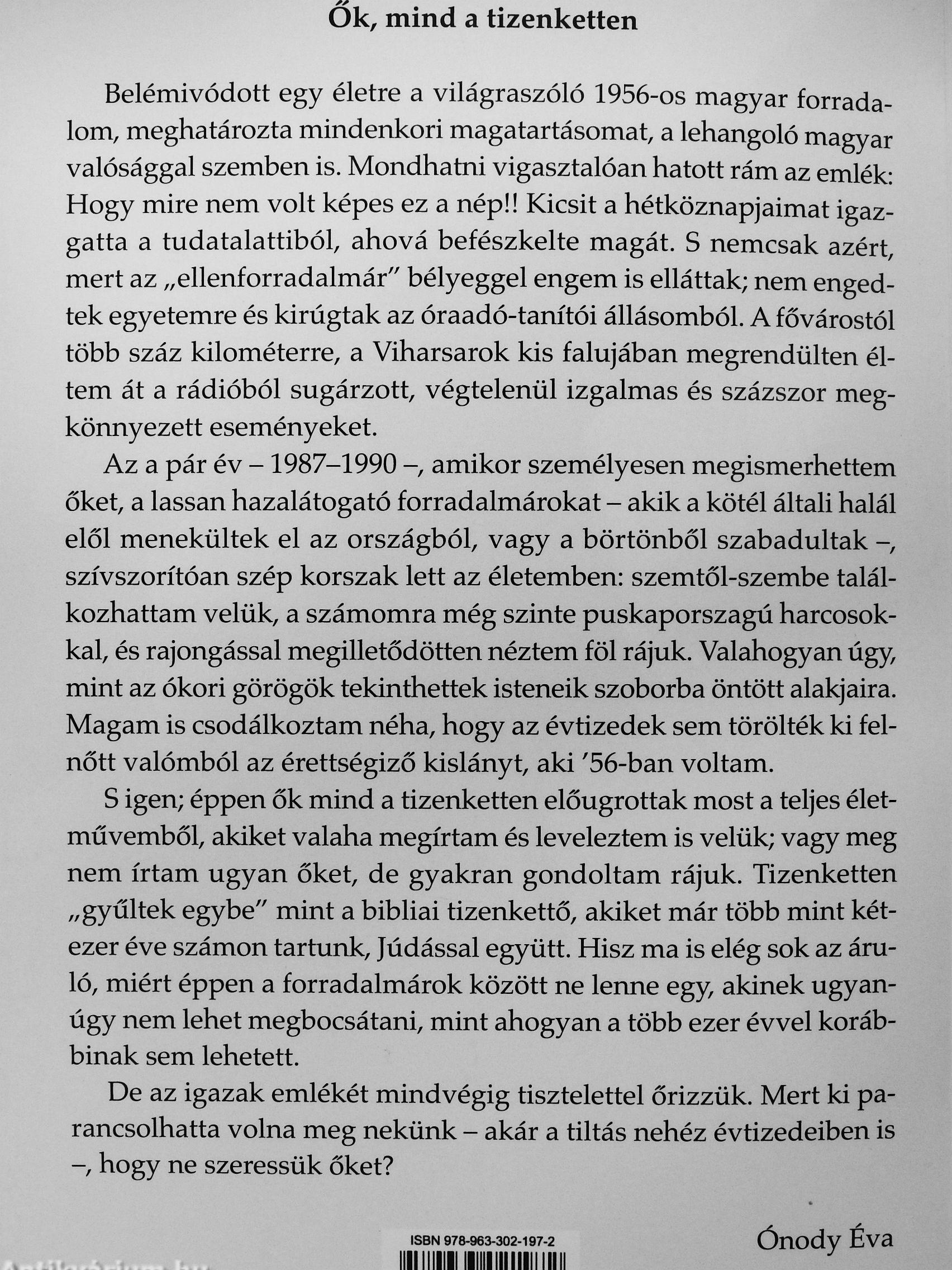 S igen; éppen ők mind a tizenketten előugrottak most a teljes életművemből, akiket valaha megírtam és leveleztem is velük; vagy meg nem írtam ugyan őket, de gyakran gondoltam rájuk. Tizenketten „gyűltek egybe" mint a bibliai tizenkettő, akiket már több mint kétezer éve számon tartimk, Júdással együtt. Hisz ma is elég sok az áruló, miért éppen a forradalmárok között ne lerme egy, akinek ugyanúgy nem lehet megbocsátani, mint ahogyan a több ezer évvel korábbinak sem lehetett.
