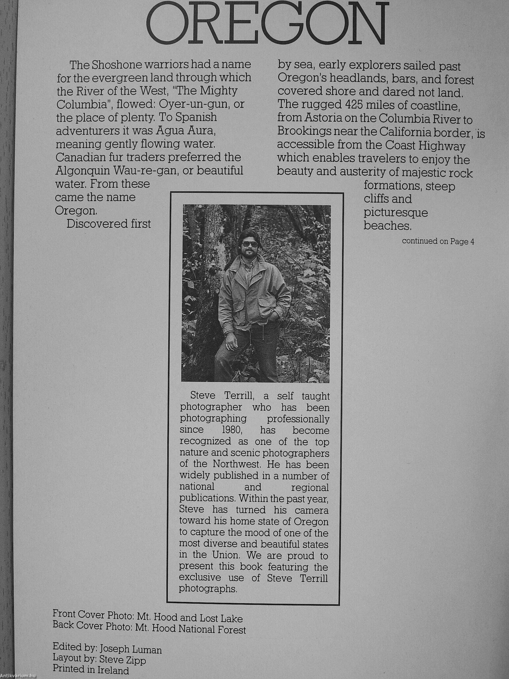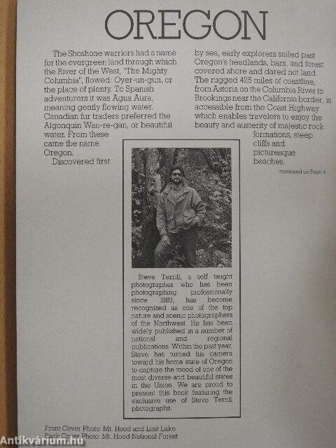 Steve Terrill, a self taught photographer who has been photographing professionally since 1980, has become recognized as one of the top nature and scenic photographers of the Northwest. He has been widely published in a number of national and regional pi±ilications. Within the past year, Steve has turned his camera toward his home state of Oregon to capture the mood of one of the most diverse and beautiful states in the Union. We are proud to present this book featuring the exclusive use of Steve Terrill photographs.