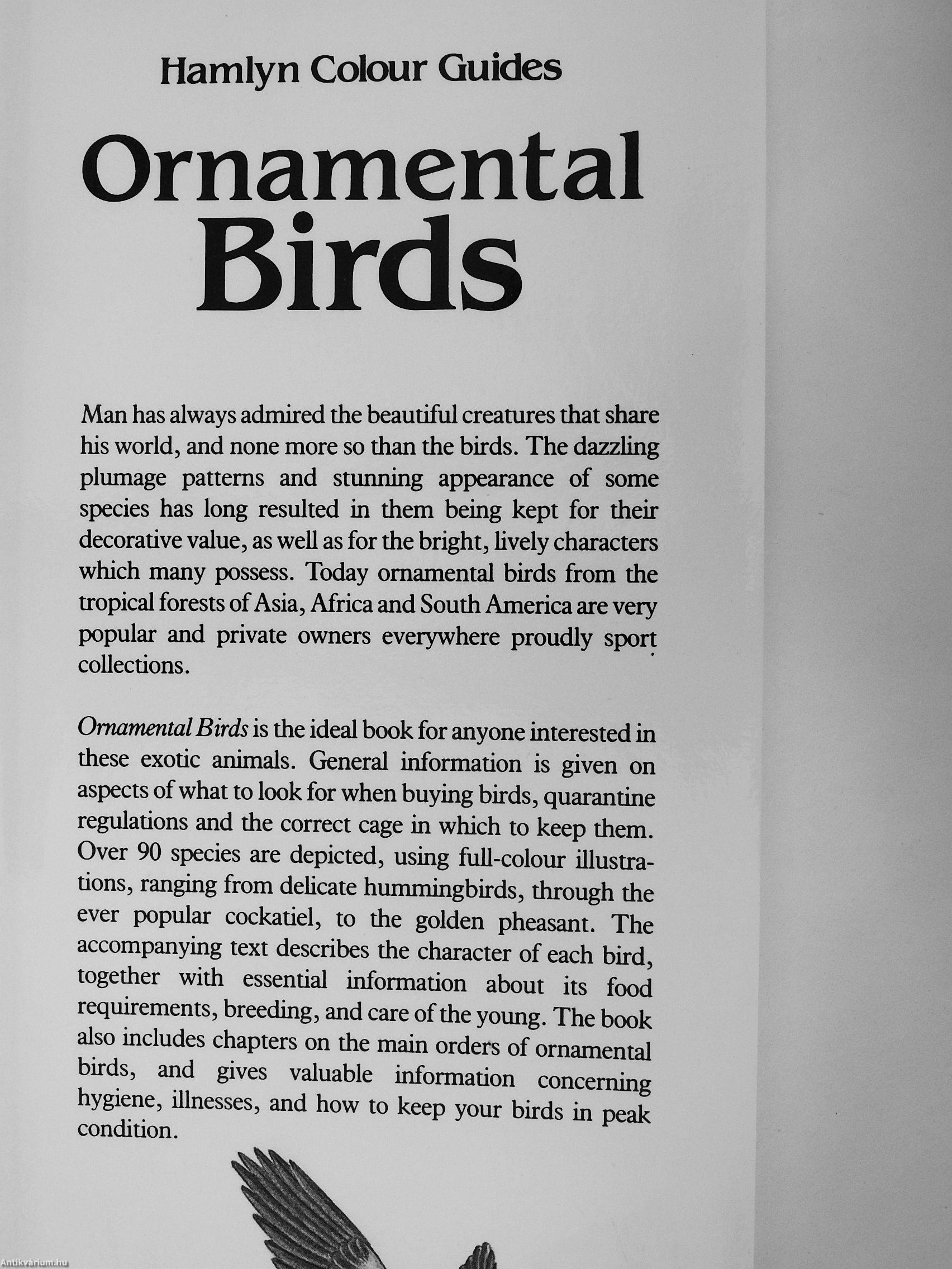 Ornamental Birds is the ideal book for anyone interested in these exotic animals. General information is given on aspects of what to look for when buying birds, quarantine regulations and the correct cage in which to keep them. Over 90 species are depicted, using full-colour illustrations, ranging from delicate himimingbirds, through the ever popular cockatiel, to the golden pheasant. The accompanying text describes the character of each bird, together with essential information about its food requirements, breeding, and care of the young. The book also includes chapters on the main orders of ornamental birds, and gives valuable information concerning hygiene, illnesses, and how to keep your birds in peak condition.