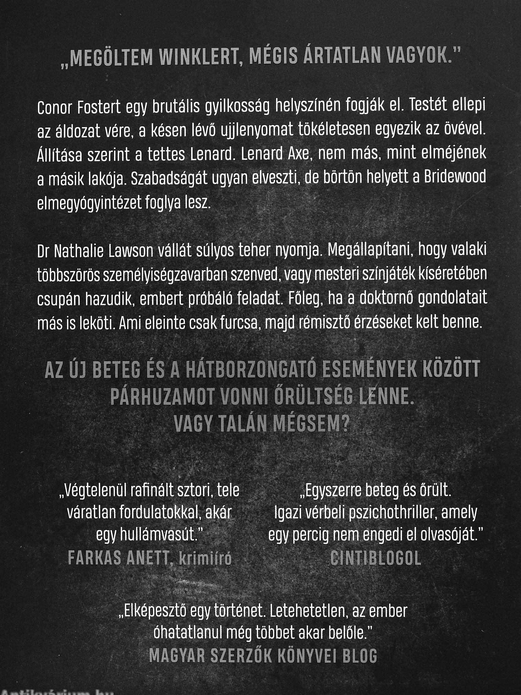 „Egyszerre beteg és őrült. Igazi vérbeli pszichothriller, amely egy percig nem engedi el olvasóját." eiNTIBLOGOL
