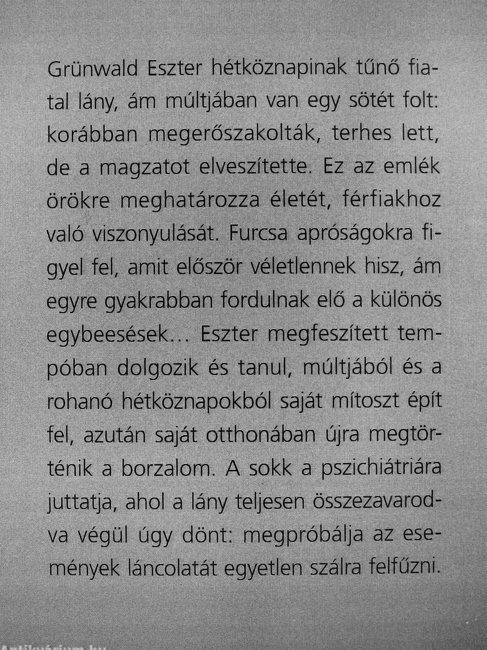 Grünwald Eszter hétköznapinak tűnő fiatal lány, ám múltjában van egy sötét folt: korábban megerőszakolták, terhes lett, de a magzatot elveszítette. Ez az emlék örökre meghatározza életét, férfiakhoz való viszonyulását. Furcsa apróságokra figyel fel, amit először véletlennek hisz, ám egyre gyakrabban fordulnak elő a különös egybeesések Eszter megfeszített tempóban dolgozik és tanul, múltjából és a rohanó hétköznapokból saját mítoszt épít fel, azután saját otthonában újra megtörténik a borzalom. A sokk a pszichiátriára uttatja, ahol a lány teljesen összezavarodva végül úgy dönt: megpróbálja az események láncolatát egyetlen szálra felfűzni.