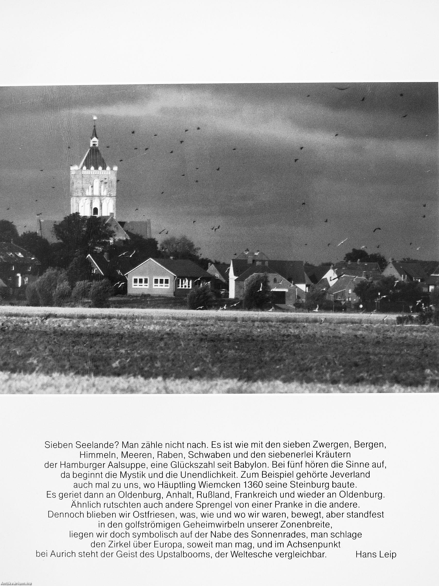 Ähnlich rutschten auch andere Sprengel von einer Pranke in die andere. Dennoch blieben wir Ostfriesen, was, wie und wo wir waren, bewegt, aber standfest in den golfströmigen Geheimwirbeln unserer Zonenbreite, liegen wir doch symbolisch auf der Nabe des Sonnenrades, man schlage den Zirkel über Europa, soweit man mag, und im Achsenpunkt bei Aurich steht der Geist des Upstalbooms, der Weltesche vergleichbar. Hans Leip