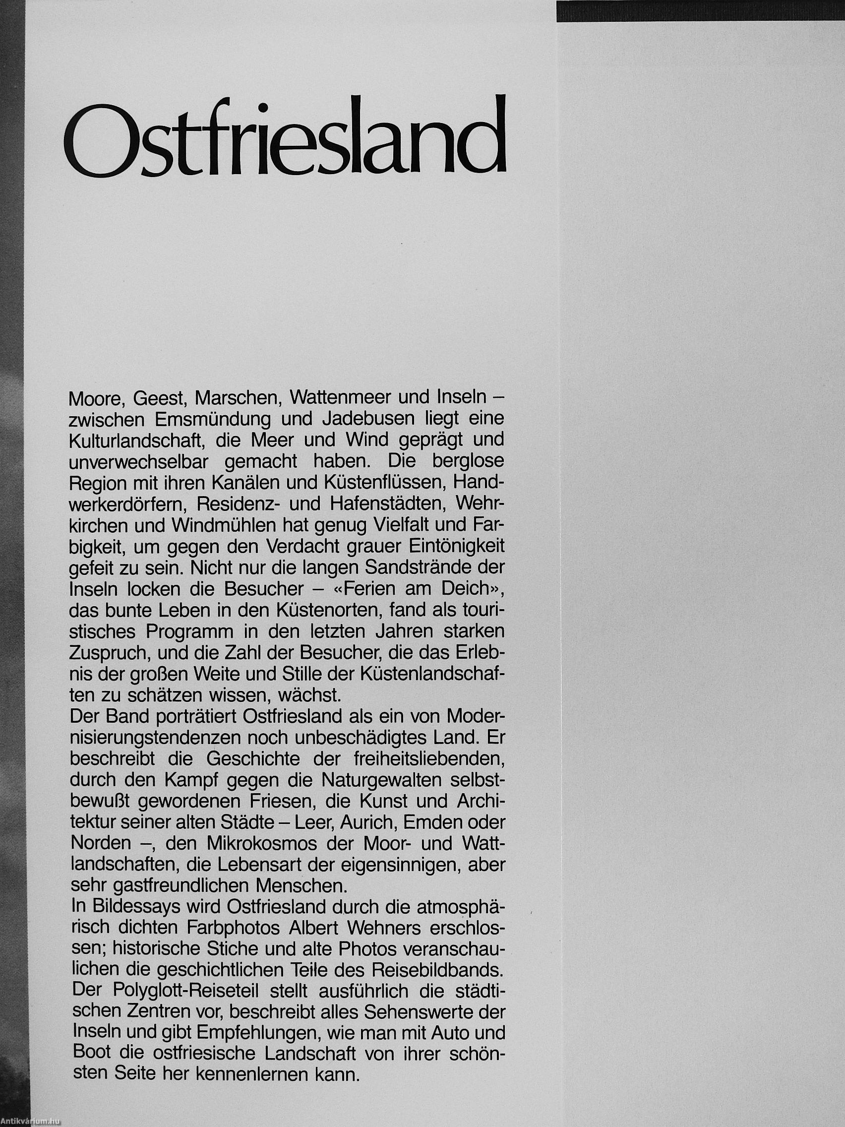Moore, Geest, Marschen, Wattenmeer und Inseln -zwischen Emsmündung und Jadebusen liegt eine Kulturlandschaft, die Meer und Wind geprägt und unverwechselbar gemacht haben. Die berglose Region mit ihren Kanälen und Küstenflüssen, Hand-werl<erdörfern, Residenz- und Hafenstädten, Wehr-l<irchen und Windmühlen hat genug Vielfalt und Farbigkeit, um gegen den Verdacht grauer Eintönigkeit gefeit zu sein. Nicht nur die langen Sandstrände der Inseln locken die Besucher - «Ferien am Deich», das bunte Leben in den Küstenorten, fand als touristisches Programm in den letzten Jahren starken Zuspruch, und die Zahl der Besucher, die das Erlebnis der großen Weite und Stille der Küstenlandschaften zu schätzen wissen, wächst. Der Band porträtiert Ostfriesland als ein von Modernisierungstendenzen noch unbeschädigtes Land. Er beschreibt die Geschichte der freiheitsliebenden, durch den Kampf gegen die Naturgewalten selbstbewußt gewordenen Friesen, die Kunst und Architektur seiner alten Städte - Leer, Aurich, Emden oder Norden -, den Mikrokosmos der Moor- und Wattlandschaften, die Lebensart der eigensinnigen, aber sehr gastfreundlichen Menschen. In Bildessays wird Ostfriesland durch die atmosphärisch dichten Farbphotos Albert Wehners erschlossen; historische Stiche und alte Photos veranschaulichen die geschichtlichen Teile des Reisebildbands. Der Polyglott-Reiseteil stellt ausführiich die städtischen Zentren vor, beschreibt alles Sehenswerte der Inseln und gibt Empfehlungen, wie man mit Auto und Boot die ostfriesische Landschaft von ihrer schönsten Seite her kennenlernen kann.